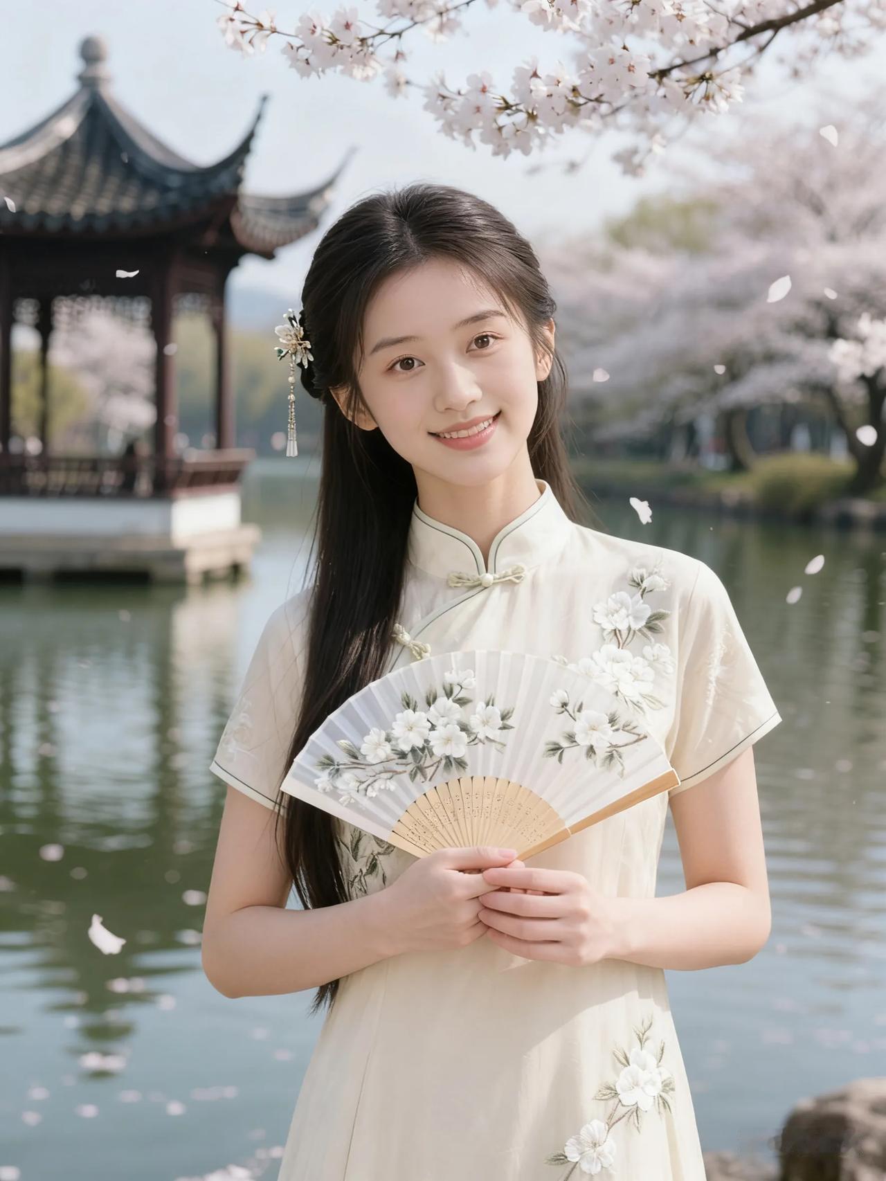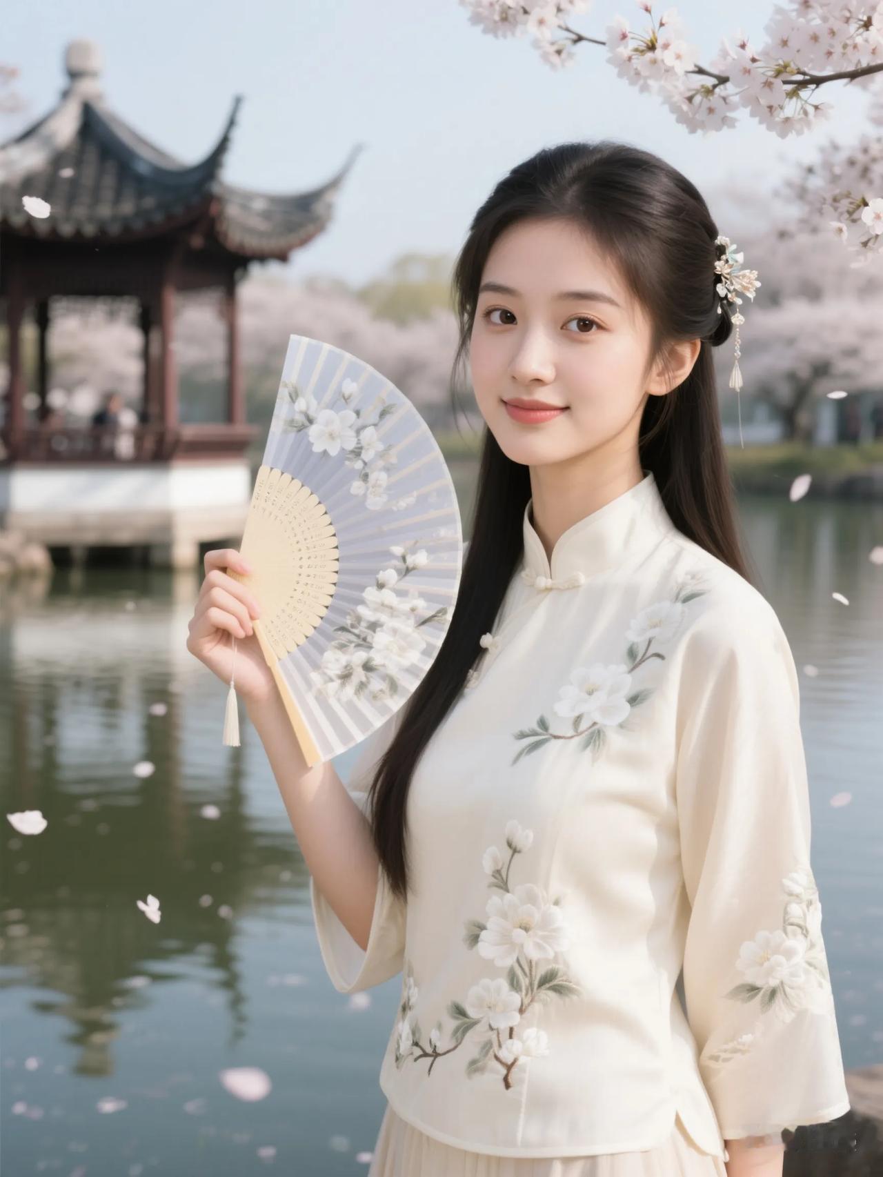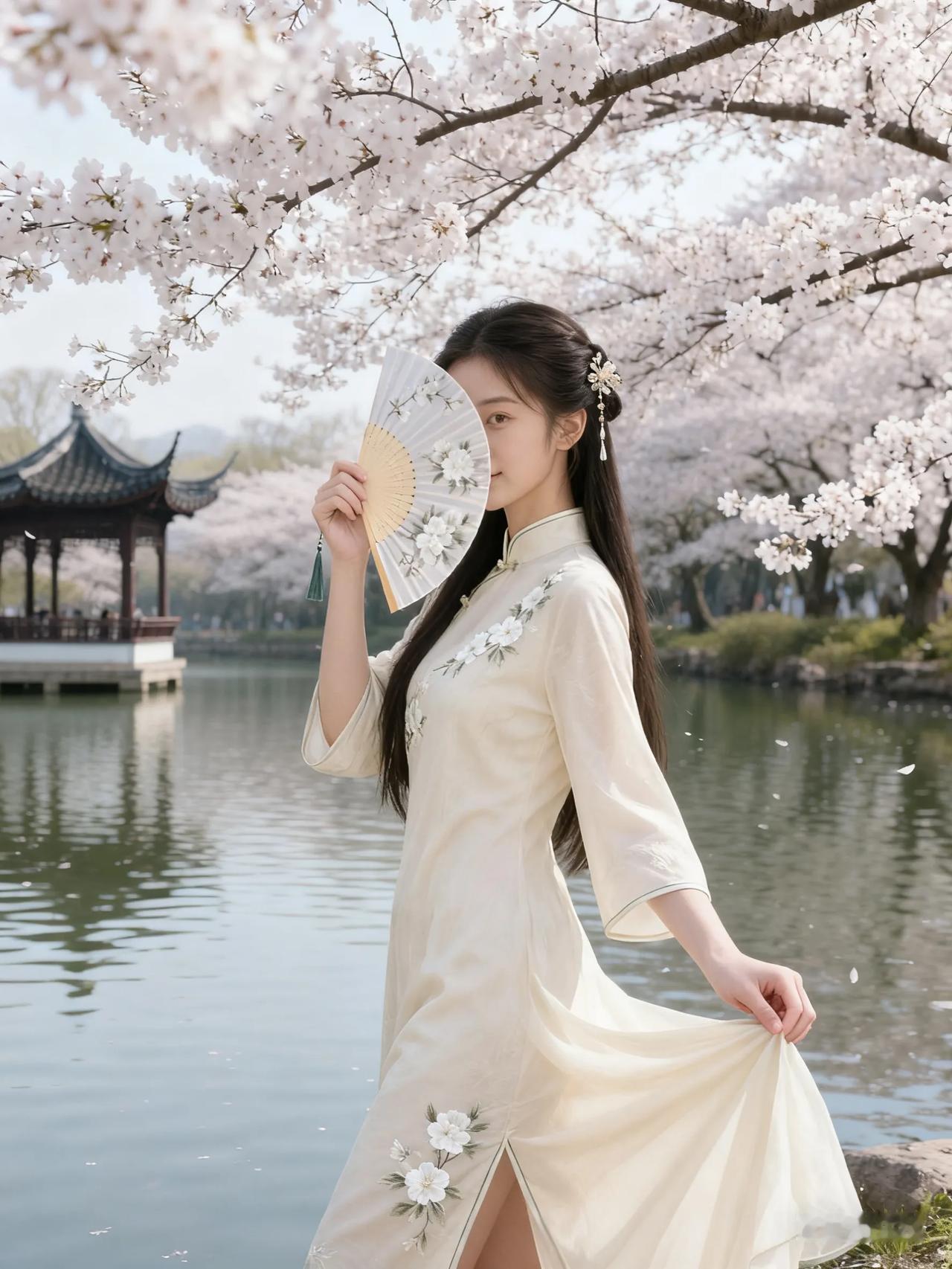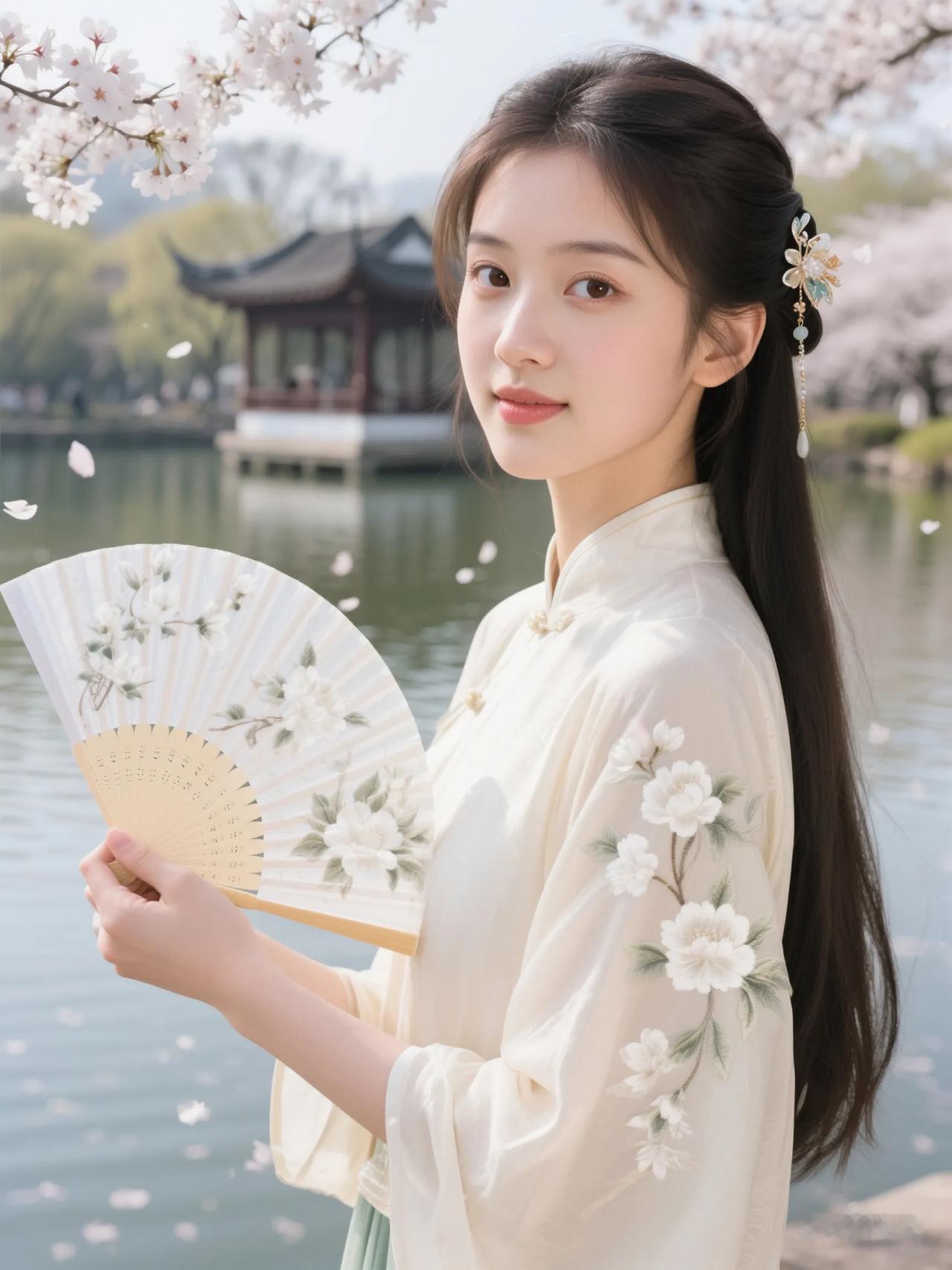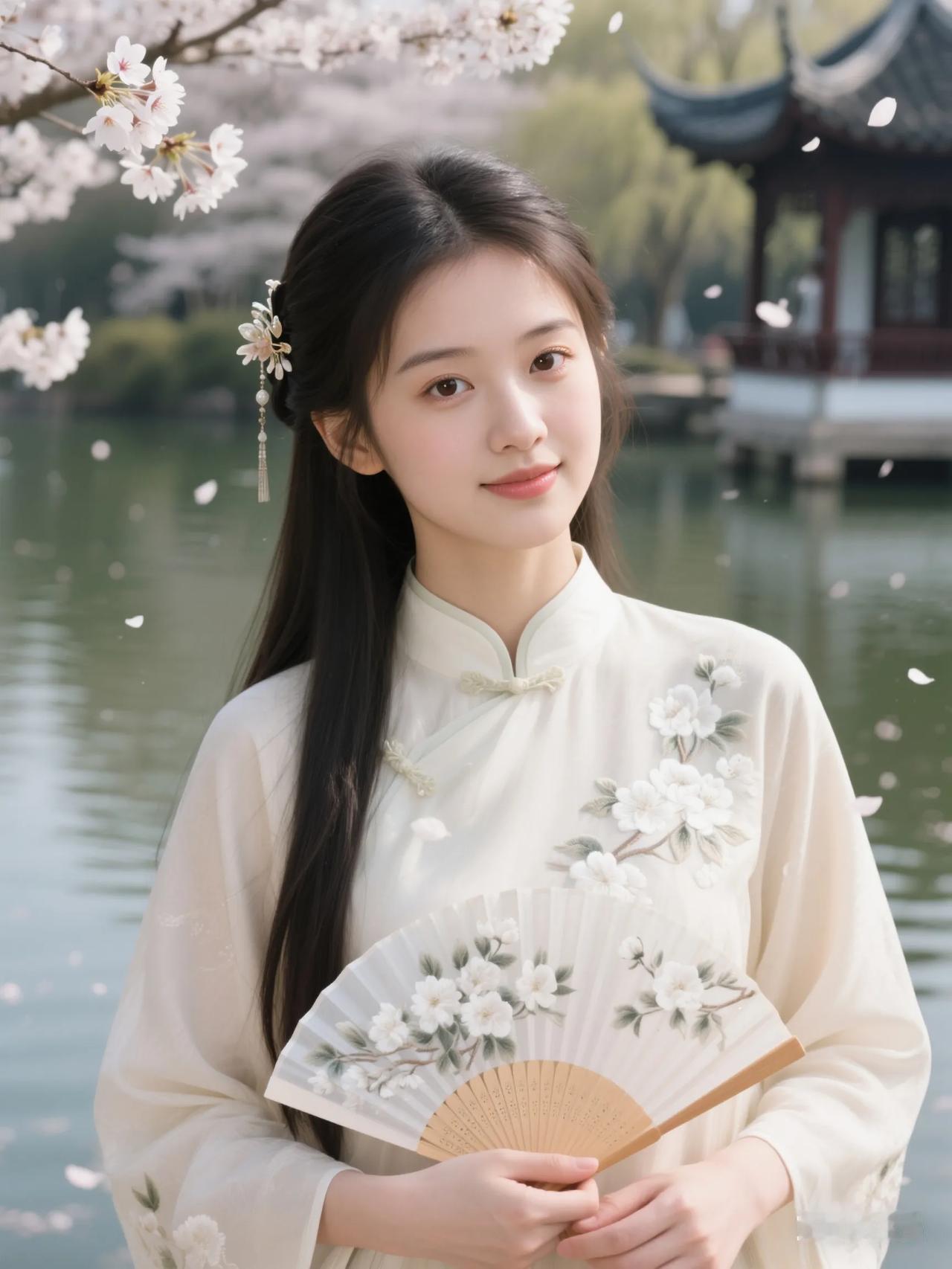 樱花树下,古风少女,手持折扇,唯美如画。