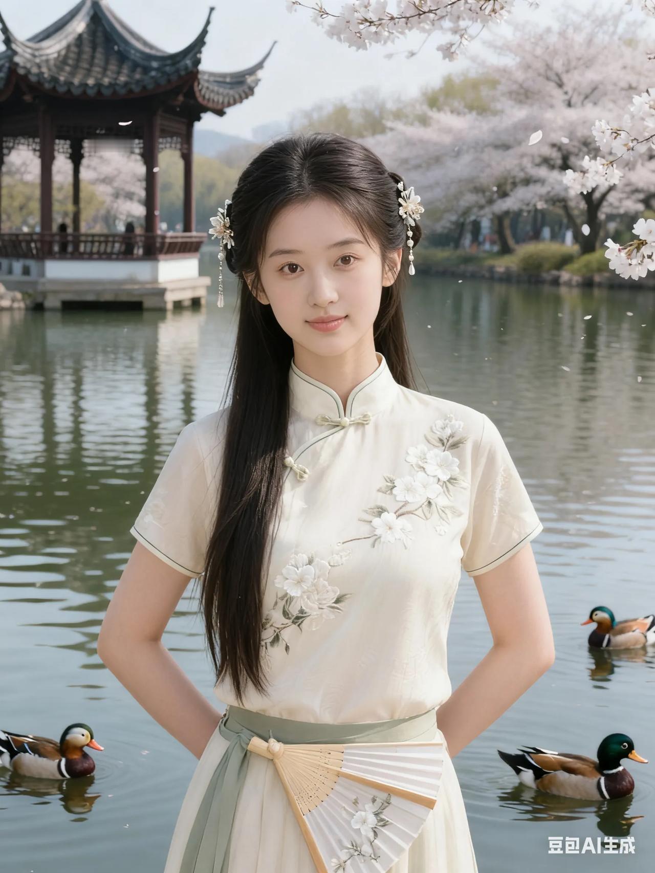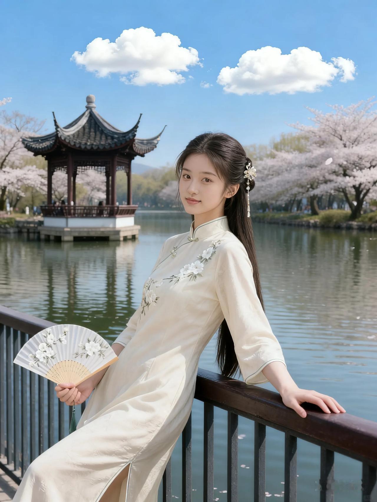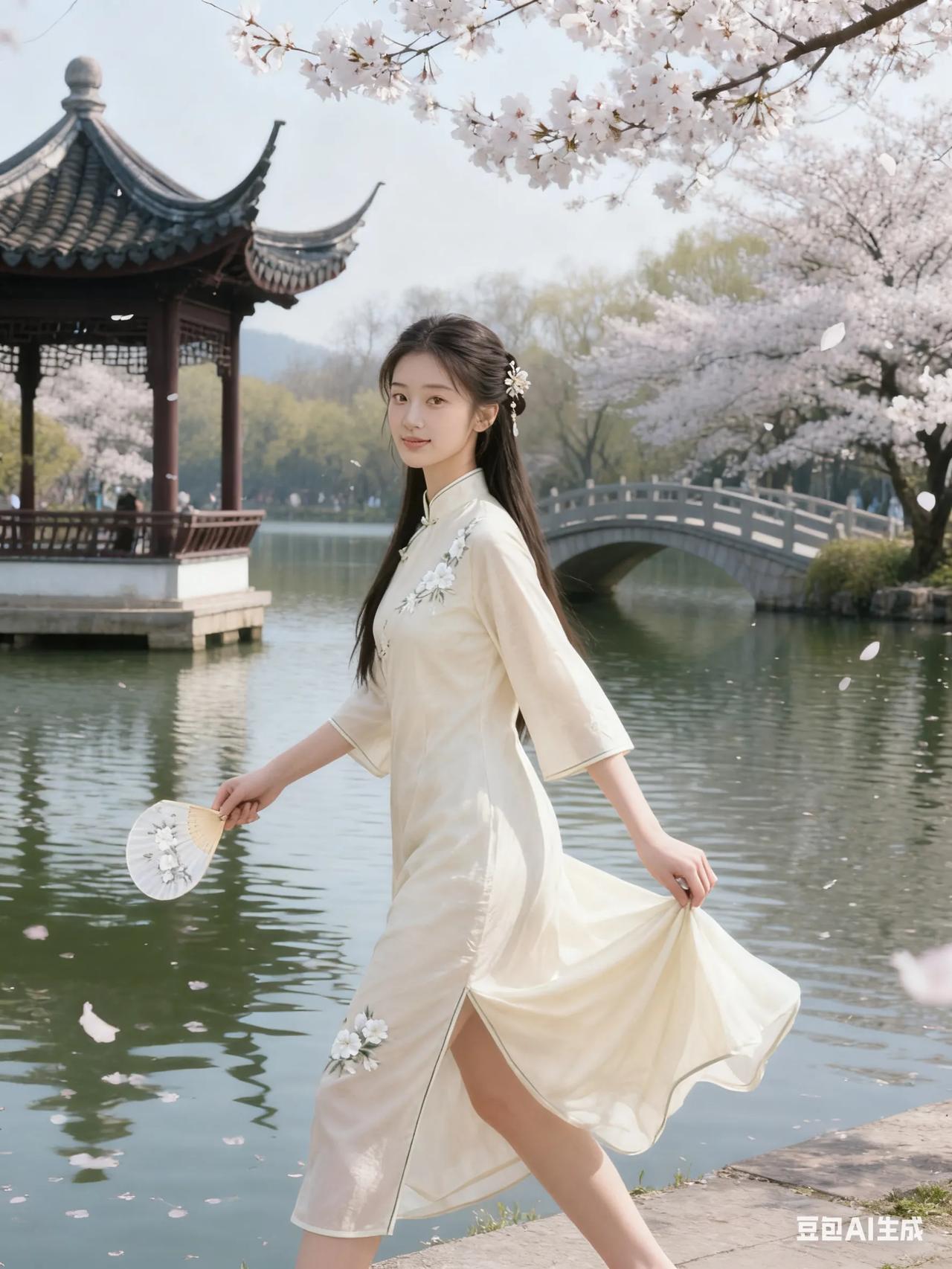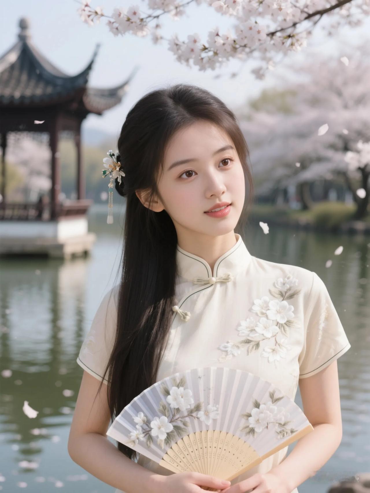 樱花树下,古风少女,手持折扇,唯美如画。