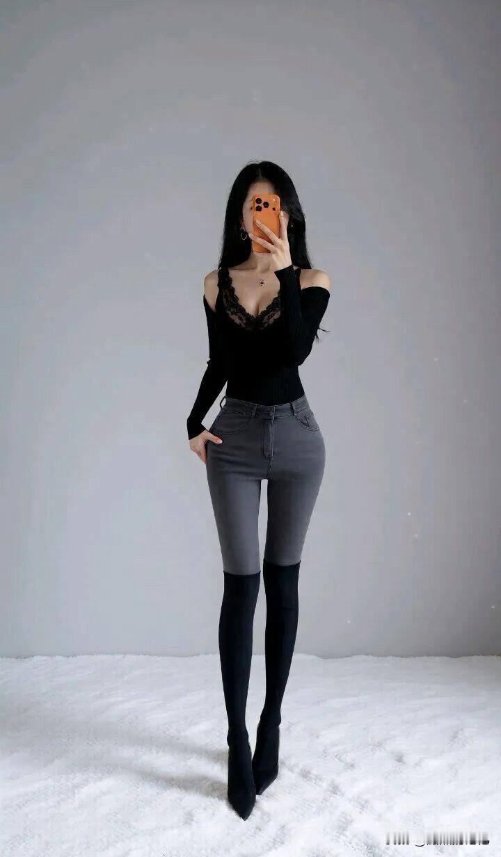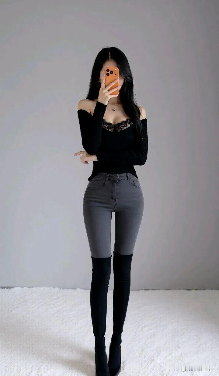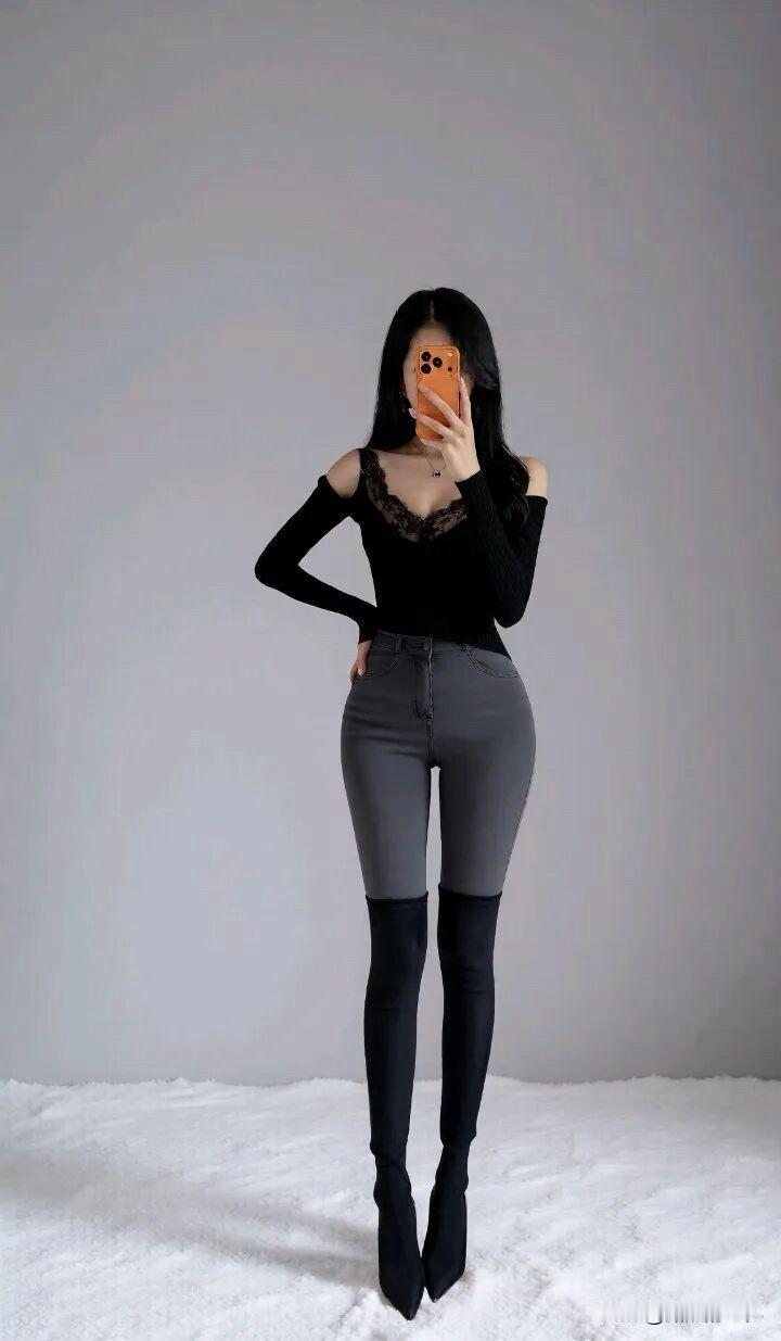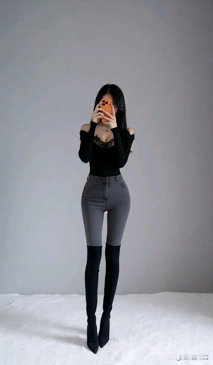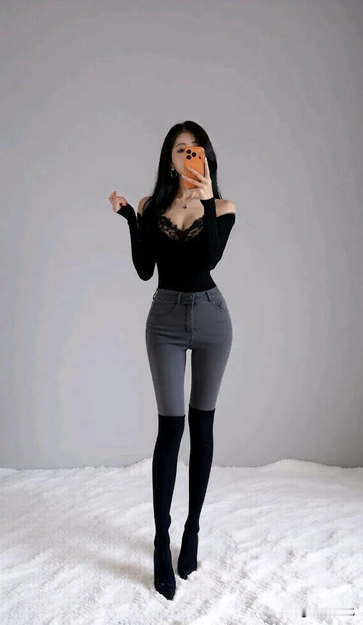 牛仔裤塞进过膝靴那一刻,腰线拉到胸口,男友路过直接看呆三秒,口水差点没收住![比