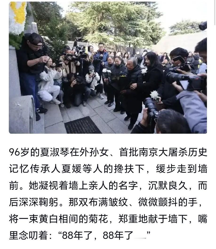 11月30日,侵华日军南京大屠杀遇难同胞纪念馆的遇难者名单墙前,96岁的夏淑琴在外孙女搀扶下缓缓走来。看着墙上亲人的名字,她沉默鞠躬,献上菊花,念叨着“88年了”。这名单墙1995年建成,最初3000个名字,如今已增至一万余个。 夏淑琴8岁经历南京大屠杀,全家九口死了七口,她自己也挨了三刀。她带着伤痛活到96岁,说出“不能等了”。她等的或许是日本对历史的正视。 A网友:不论是谁,犯我中华的罪责永不可饶恕,人不犯我我不犯人,无故犯我中华者必将身不如死,不是不报时候未到,相信国家,相信国人。 B网友:我们不否认日本有爱好和平、勇于面对历史的人,但这个国家的反人类罪行和军国主义依然是世界人民看到的第一表象,为了补偿那些受害者,更为了避免历史重演给日本人民带来更悲惨的伤痛,强烈请求联合国安理会五大常任理事国严格履行《联合国宪章》,反法西斯同盟严格遵照《波茨坦公告》等战后条约,彻底肃清军国主义、纳粹主义和法西斯主义温床! C网友:血债必须要用血来偿还!灭倭国为屈死的3500万先烈和先辈报仇!奶奶身上的疤、流的泪,都在提醒我们不能忘。愿幸存者们等的那一天早日到来。我们永远没有资格替她们原谅日本人。 看96岁的夏淑琴奶奶说“等不了了”,心里很不是滋味。88年啊,那些逝去的亲人,那些惨痛的记忆,是民族刻在骨里的伤。 时间流逝,但历史伤痛不该被遗忘,希望正义早日到来。