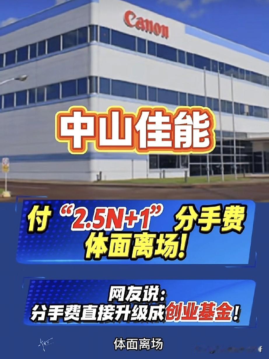 中山佳能付"2.5N+1"分手费,体面离场!你以为只是2.5N+1,那你就错了,这只是核心补偿金,还有就业支援金、特别奖金。除了钱,公司还为员工提供了求职推荐信,帮助员工在就业。 可能很多人不知道2.5N+1究竟是什么?N代表的是员工的工作年限,2.5N的意思是工龄满一年就支付2.5个月的工资作为赔偿,+1是公司额外支付的一个月工资。关键是佳能这次方案没有设置法定上限,全部按员工的实际工资和实际工龄计算。难怪网友说,分手费直接升级成创业基金。 国内有多少企业能做到佳能这样呢? 你的工资能够满足日常开销吗 中山佳能离职补偿方案你怎么看 外企