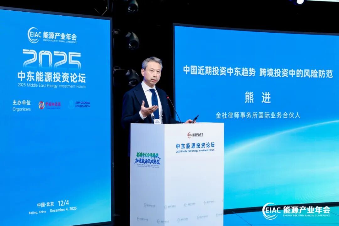 12月4日,第八届中国能源产业发展年会分论坛之一——2025中东能源投资论坛在京成功举办。金杜律师事务所国际业务合伙人熊进发表主旨演讲。
