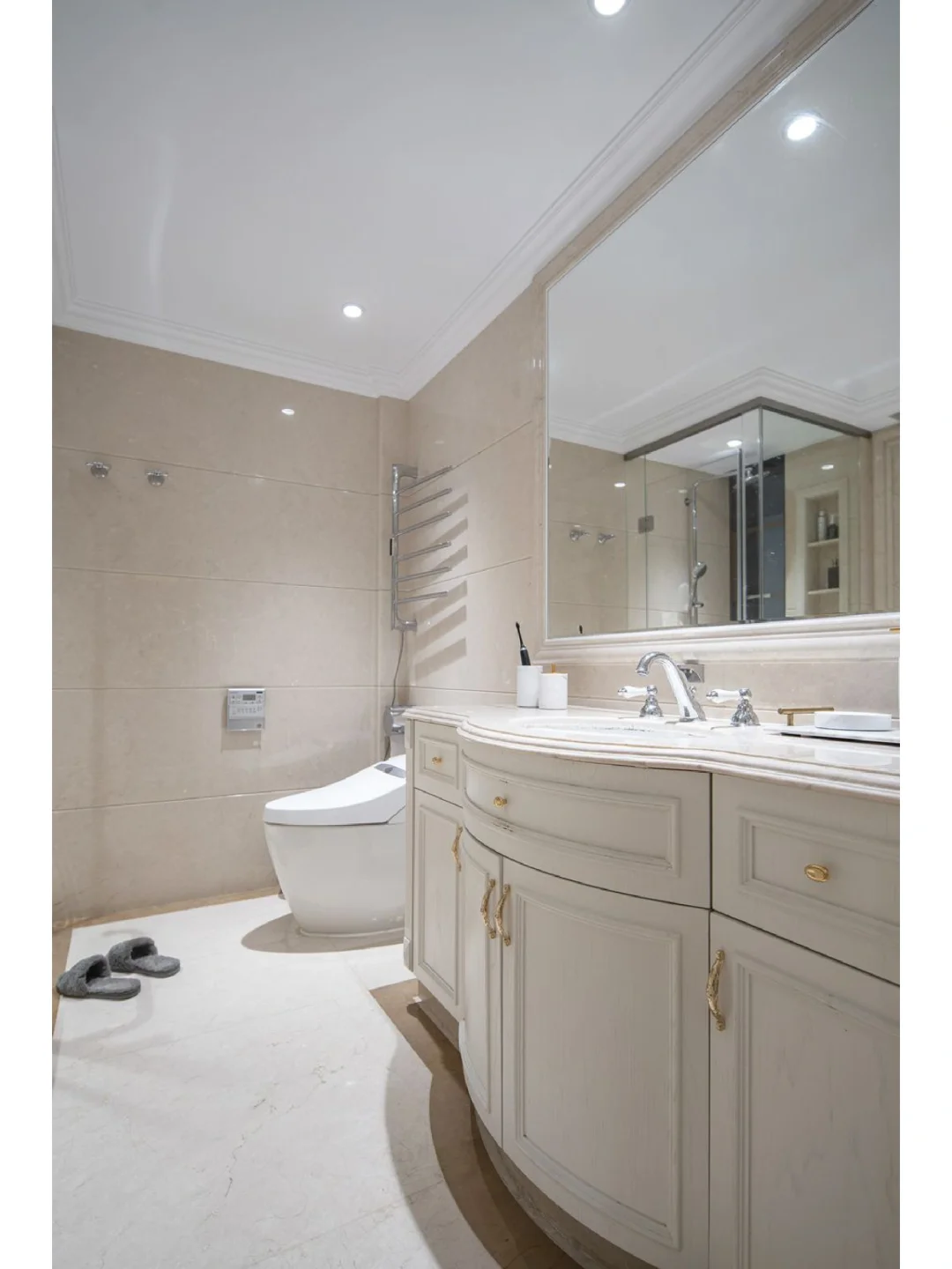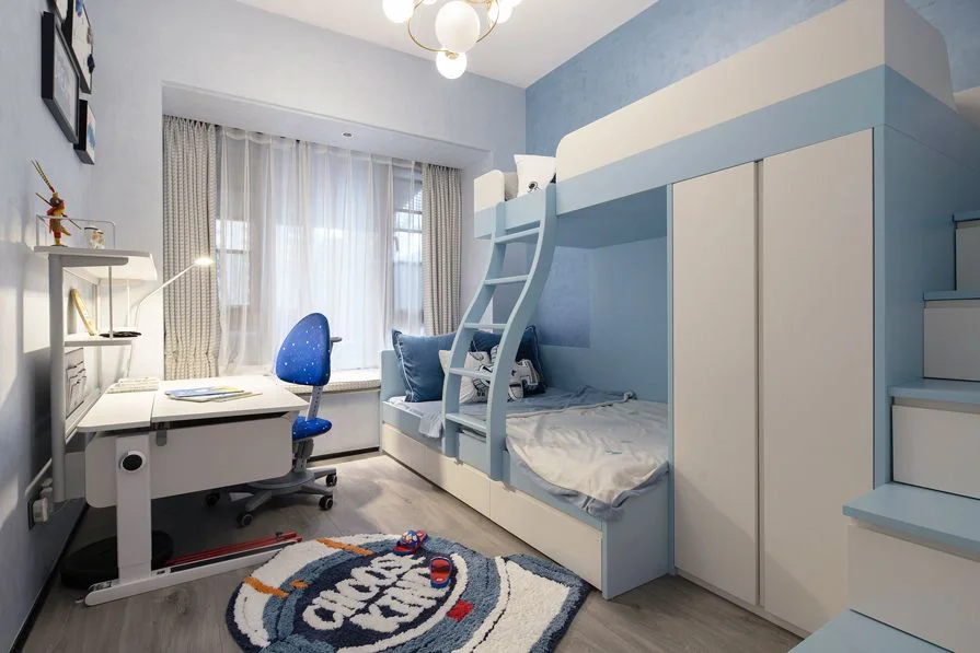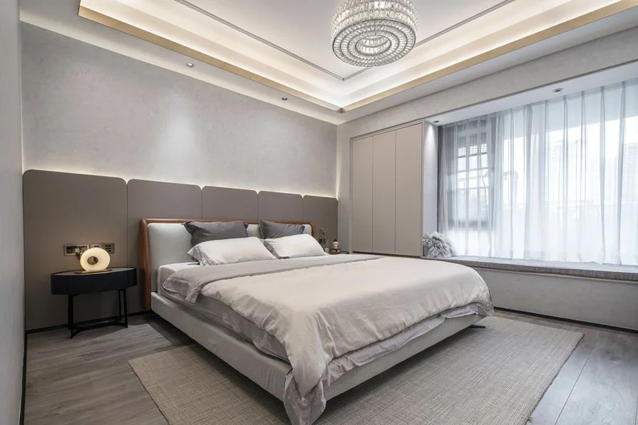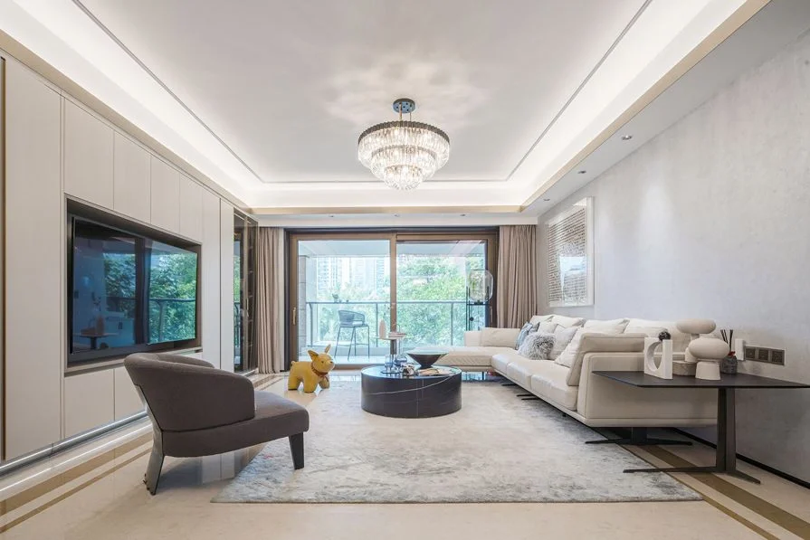 ‍🔥电视背景墙做了一个组合电视柜,整面墙除了留空中间一部分用来挂电视机之外,其他都做成收纳柜。白色实木+玻璃门搭配低调奢华,同时储物能力极强,说它是最实用的电视背景墙一点也不夸张~ ‍🔥柔软的科技布沙发+毛绒地毯温馨属实,水晶吊灯璀璨夺目。客厅与阳台之间用透明玻璃门隔开,使视觉上显得更加开阔敞亮~ ‍🔥客餐一体化很好的提高了空间利用率,岩板餐桌+咖色靠背椅干净简约。厨房与餐厅之间以带纹路的玻璃门做隔断,使整个空间没有那么单调。 ‍🔥卧室以整个空间的主色调为延续,一半深灰色护墙板一半灰色乳胶漆做背景,融合的恰到好处。飘窗处也做了定制的通顶衣柜,也能满足日常的收纳需求~ ‍🔥次卧无主灯+灯带的设计调和了屋内可能光线不均匀的问题,浅灰色护墙板温馨低调,柔软的床品+点缀的亮色软装,适合人放松休息。 ‍🔥卫生间布局清晰分明,台下盆+镜柜利落方便清洁,纯白色实木柜子既奢华又不会显得很高调,与整个空间的颜色搭配的刚刚好~