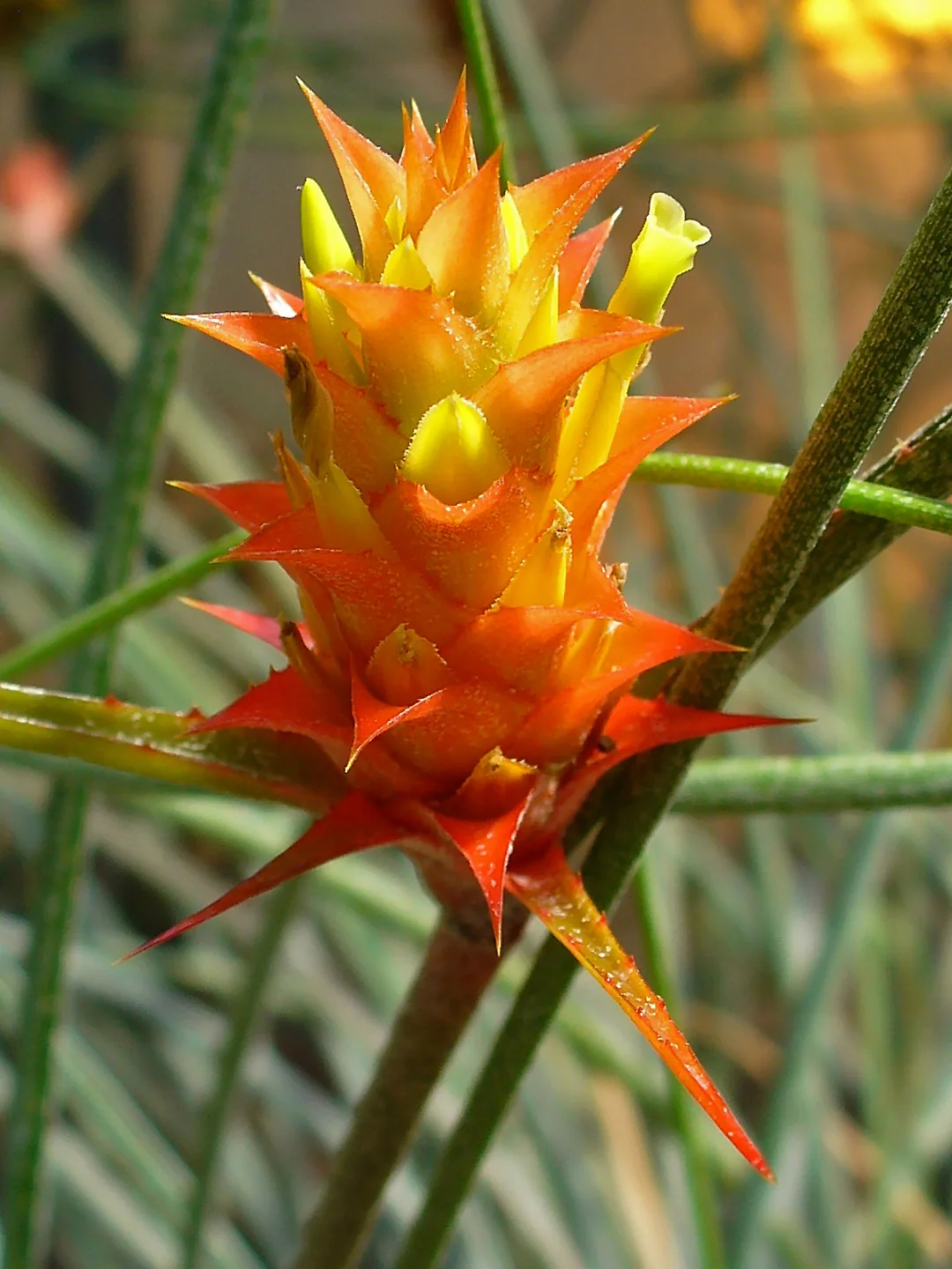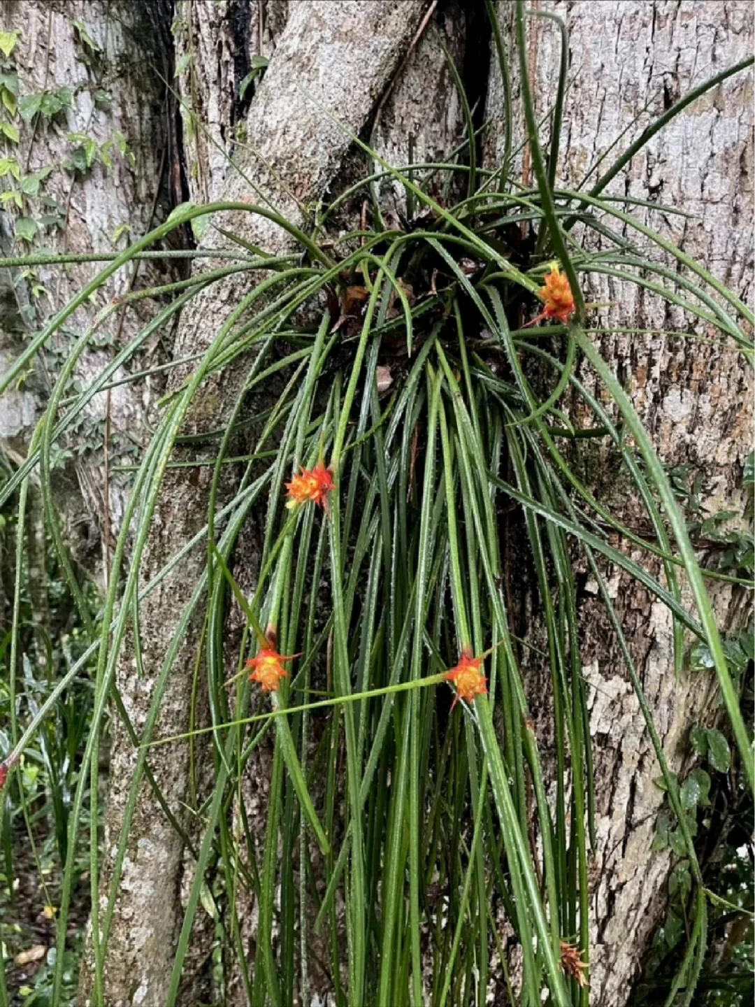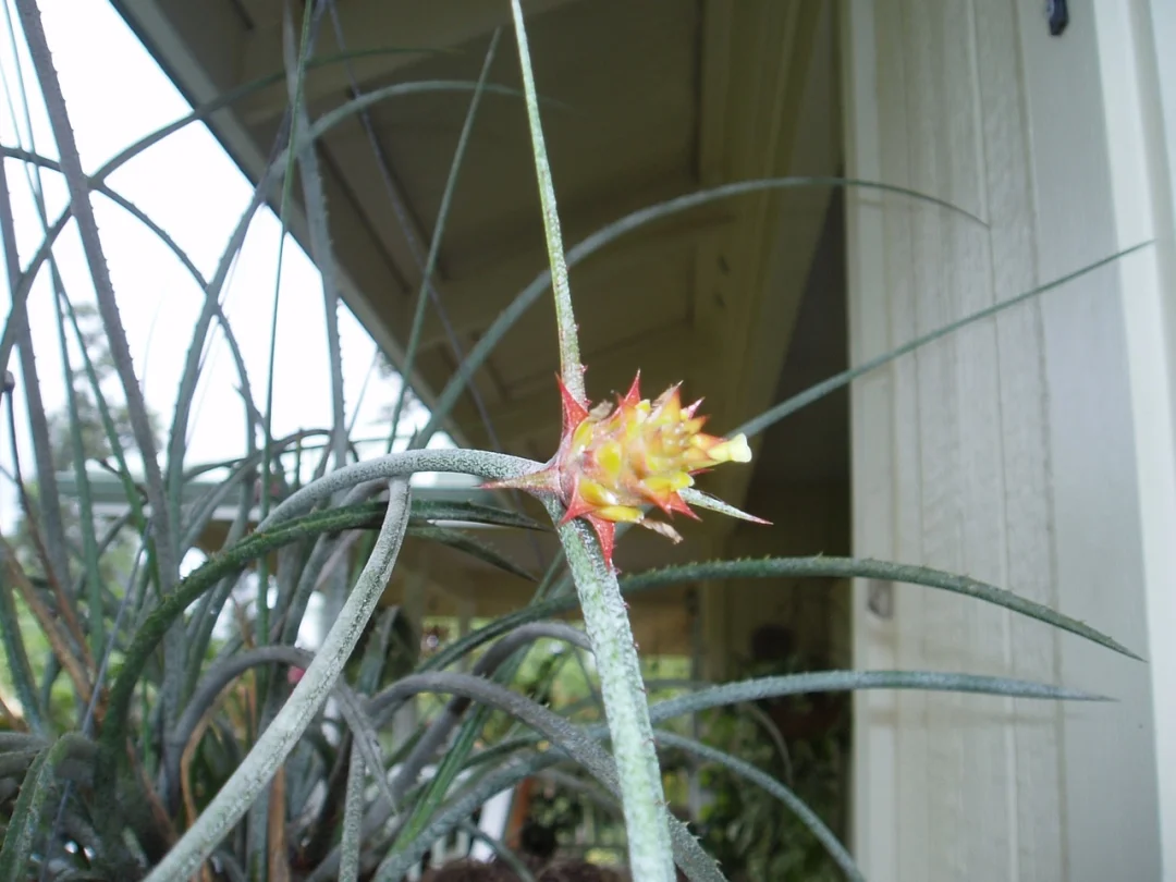 球果凤梨一种不寻常的凤梨科植物,叶长而窄,叶刺垂下约三英尺。迷人的小花是橙色和黄色的,它们形成一种小的可食用水果,尝起来像菠萝。在吊篮或挂在树上非常棒,起伏的树叶增加了很多有趣的形式。