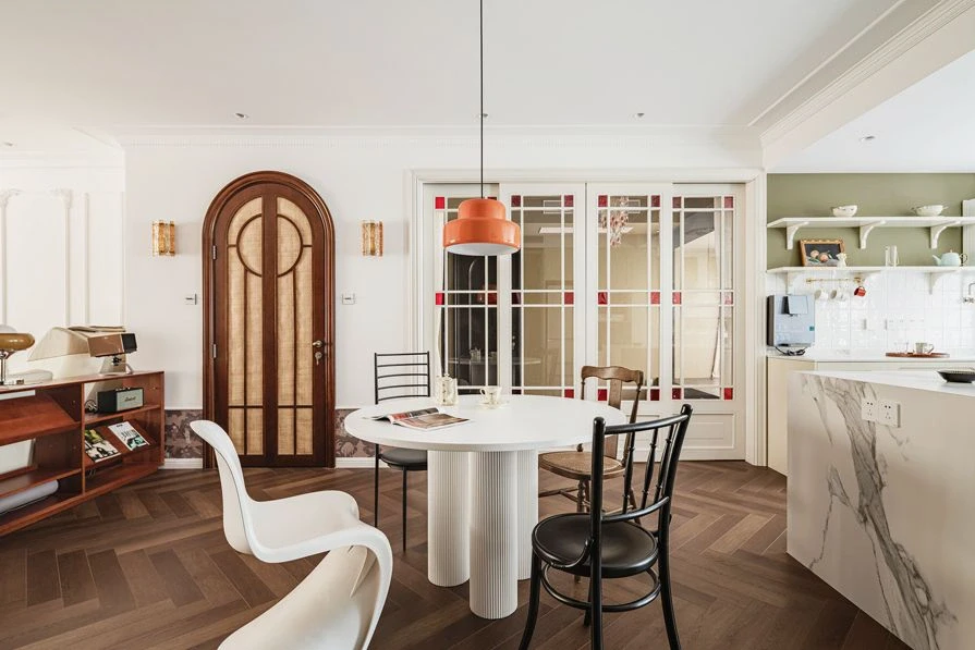 ♟客餐厅一体的布局自然贯通,餐厨地面依旧选用木纹砖,保持空间整体风格一致。黑与白的餐桌椅极简优雅,作为陪衬的玻璃隔断和褐色拱形门让餐厅层次更丰富~复古的吊灯垂下,复古高级感慢慢在空间中弥散与中和。