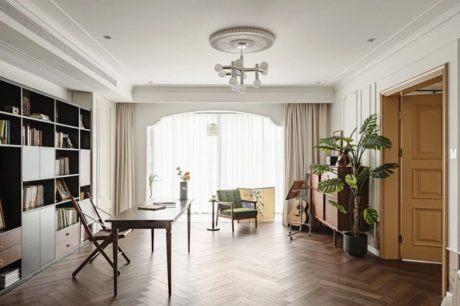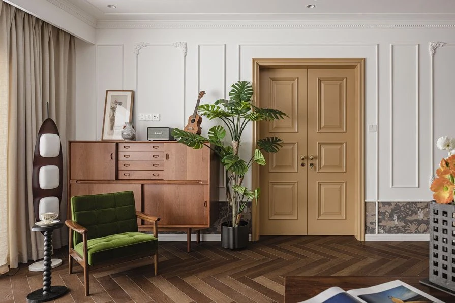 ♟步入客厅,配色淡浓相宜,复古气息满满的木纹砖打底,顶部是简约的双眼皮吊顶+一圈石膏线,以现代手法将法式调性呈现。省去了电视背景墙的设计,简约的石膏线条搭配上实木收纳柜与喜爱的清新绿植,绿色单人小沙发增添一丝俏皮乐趣,整个空间满满的质感。