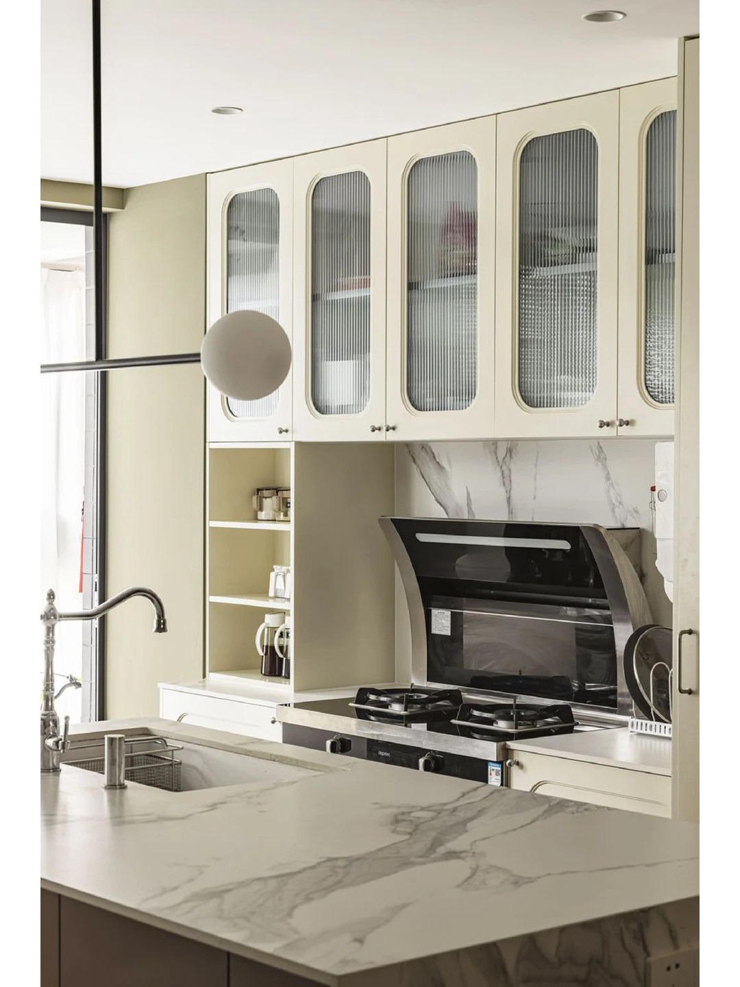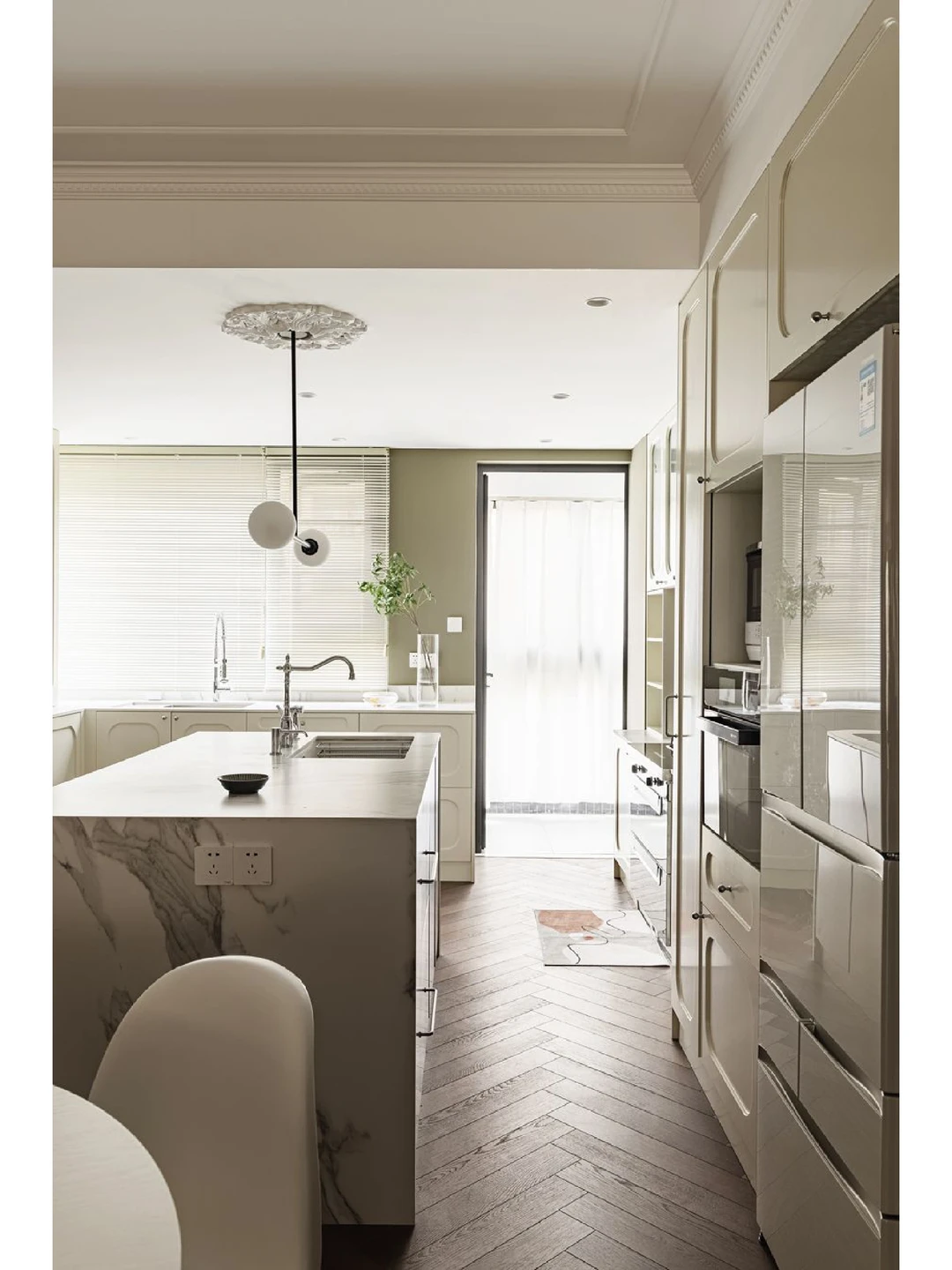 ♟除了台面上有电器摆放的位置,还做了内嵌的柜子收纳电器,让厨房变得更整洁明亮。因为跟空间统一齐平的设计,不会有任何的突兀感也让整体变得更简洁。中岛搭配上金属材质的座椅,让人会感受到舒适的轻奢感。