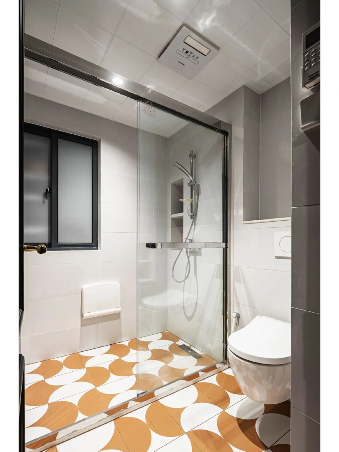 ♟干湿分区提高使用效率,玻璃门使视觉上显得空间更加通透明亮。干净耐脏的白灰色的整体墙面,选择用鲜艳的的橙色花纹交叠表述个性化。