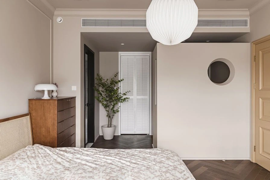 ♟主卧是集睡眠区、衣帽间、卫生间于一体的宽敞大套房,色调上延续白色+原木色的撞色搭配,无声地流露出复古范儿~