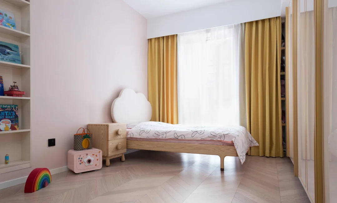 ♟儿童房将收纳空间做得比较充足,玩具和图书都有自己的专属位置,就连与窗户转角的凹位处也做了一个玩具展示柜。留出地面空间让孩子自由玩耍。