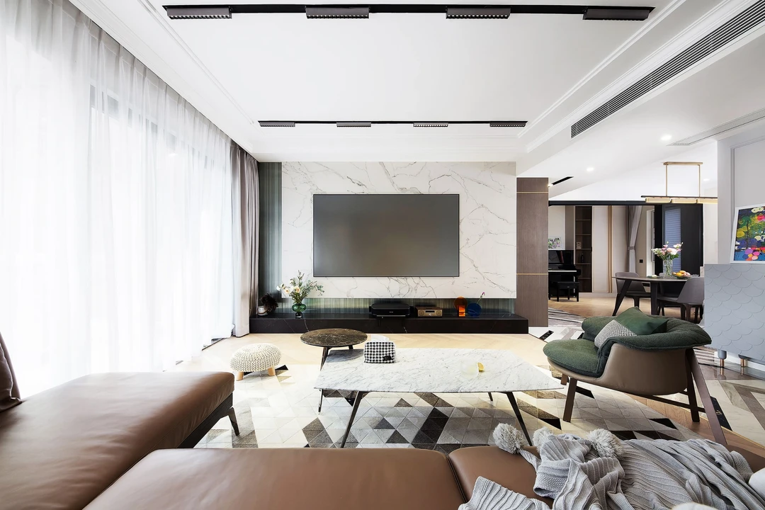 ♟客厅的无主灯设计以点、线、面相结合的方式,进行分层次照明,让空间更具高级感。而线性条状灯不仅丰富了天花的细节,也增强了空间的纵深感。