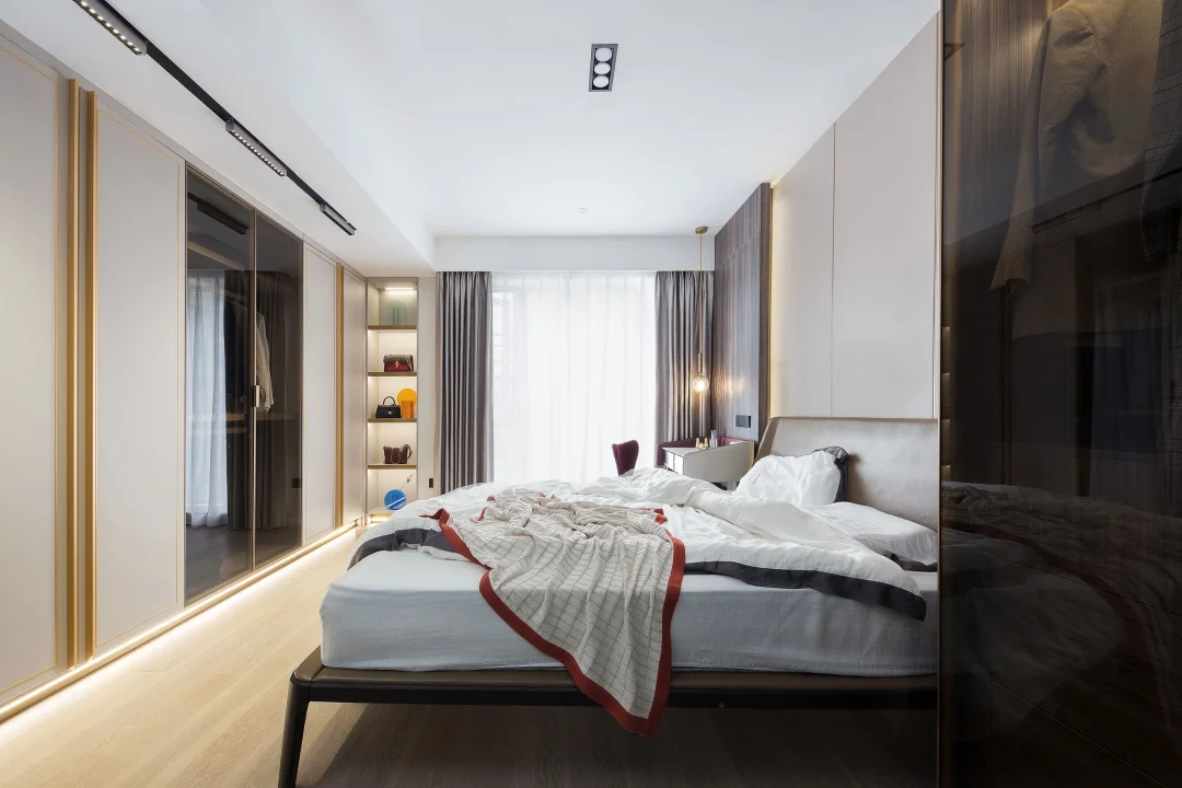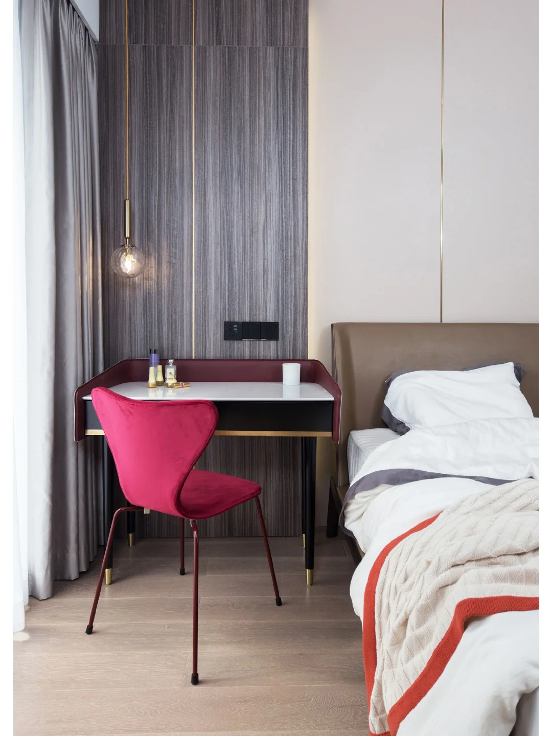 ♟床头背景是素雅的灰色硬包+烟熏橡木护墙板的形式,镶嵌不锈钢条做功能分区,床头搭配金属吊灯,顿时让空间变得优雅温馨。床头靠背与梳妆台均是围裹设计,看上去就安全感十足,简约大气的造型也令人心驰神往。搭配的暖红色梳妆椅直击空间焦点,瞬间唤醒少女心,让空间优雅温馨起来。