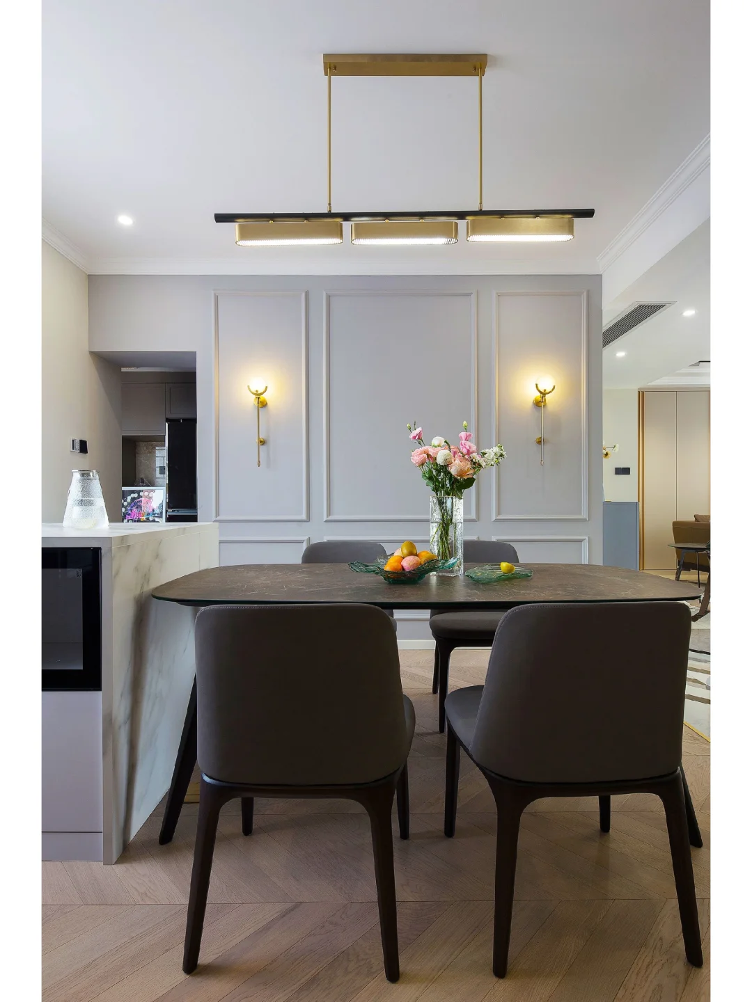 ♟餐厅皮质餐椅与黑色大理石餐桌的搭配,轻松营造出轻奢优雅的氛围,加上线型黄铜吊灯的运用,让空间既有精致气息又不失温润质感。