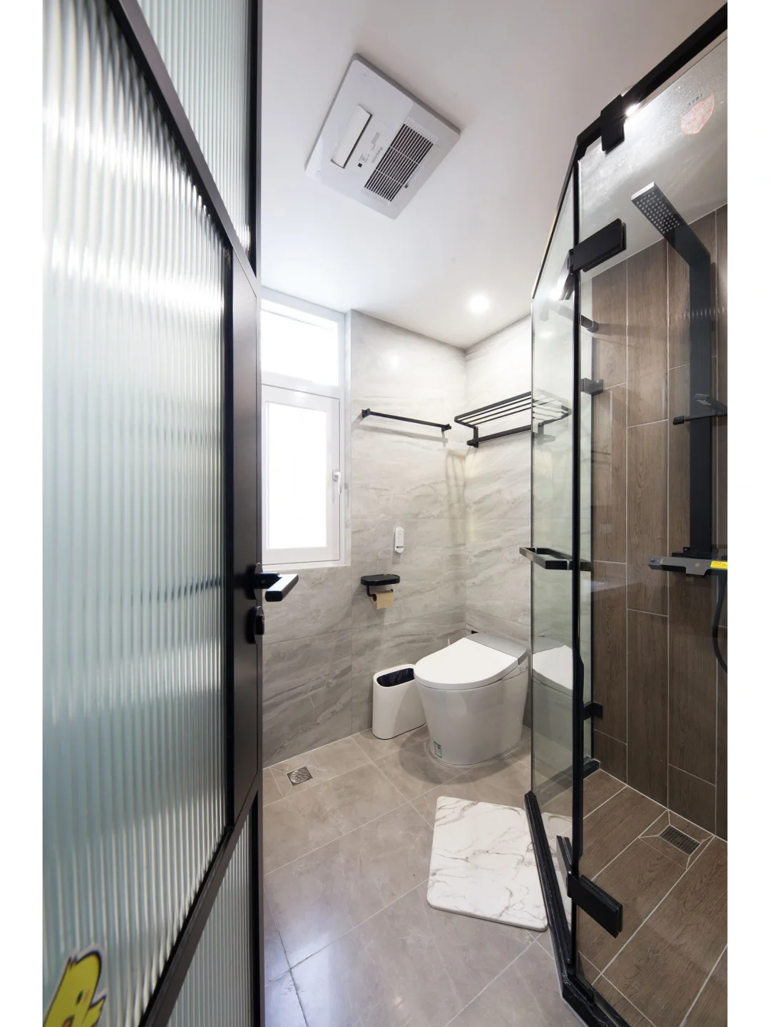 ♟卫生间利用夹角位做了钻石型淋浴房,巧妙实现干湿分离,而墙地一体通铺的木纹砖也明显区别于其它位置的瓷砖,不仅颜值高,还极具时尚品味。