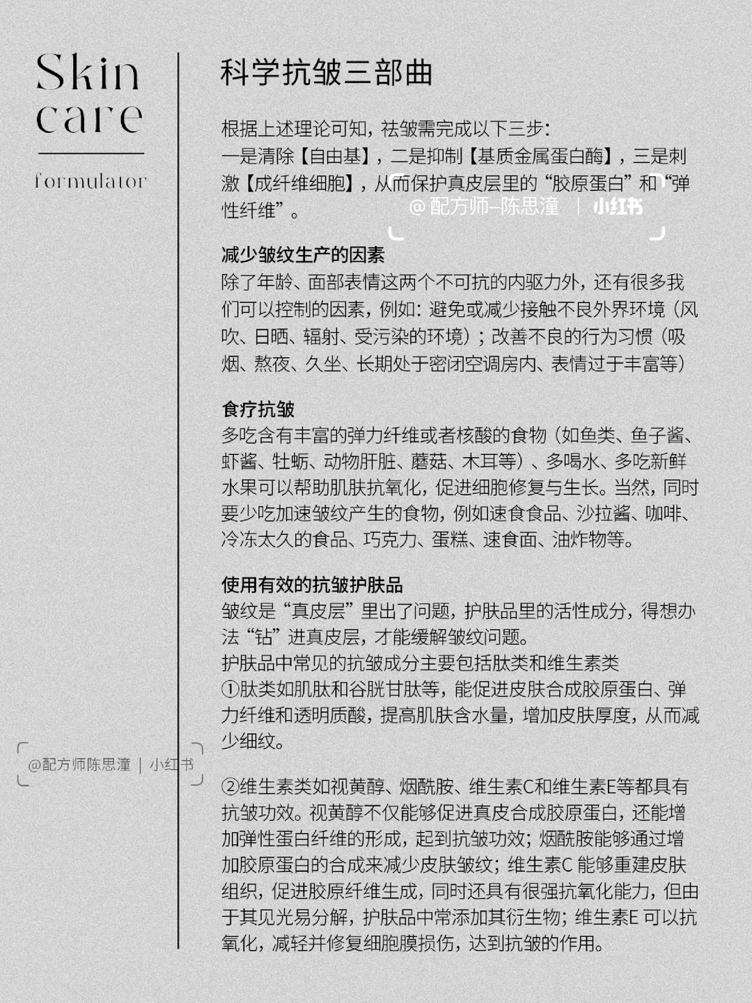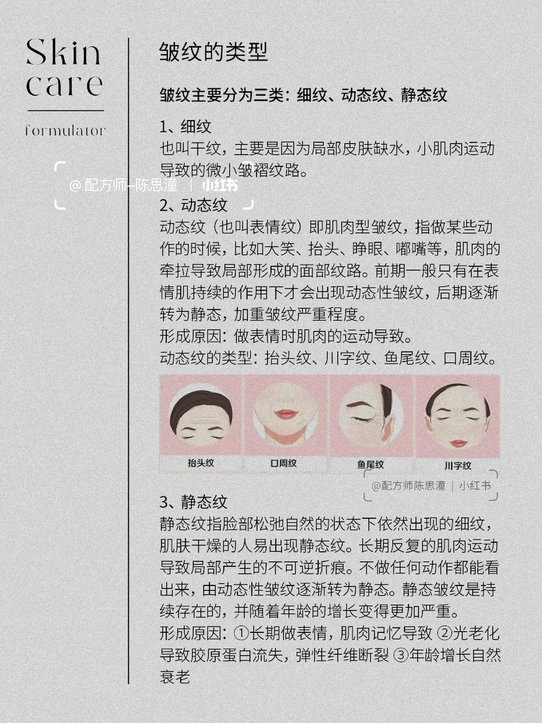 • 皱纹的类型 细纹、动态纹、静态纹 • 皱纹是如何产生的 • 影响『弹性纤维』和『胶原蛋白』的因素 氧自由基,基质金属蛋白酶,成纤维细胞 • 科学抗皱三部曲 一起来了解一下吧,下期还想看什么可以❤➕🍎告诉我哦