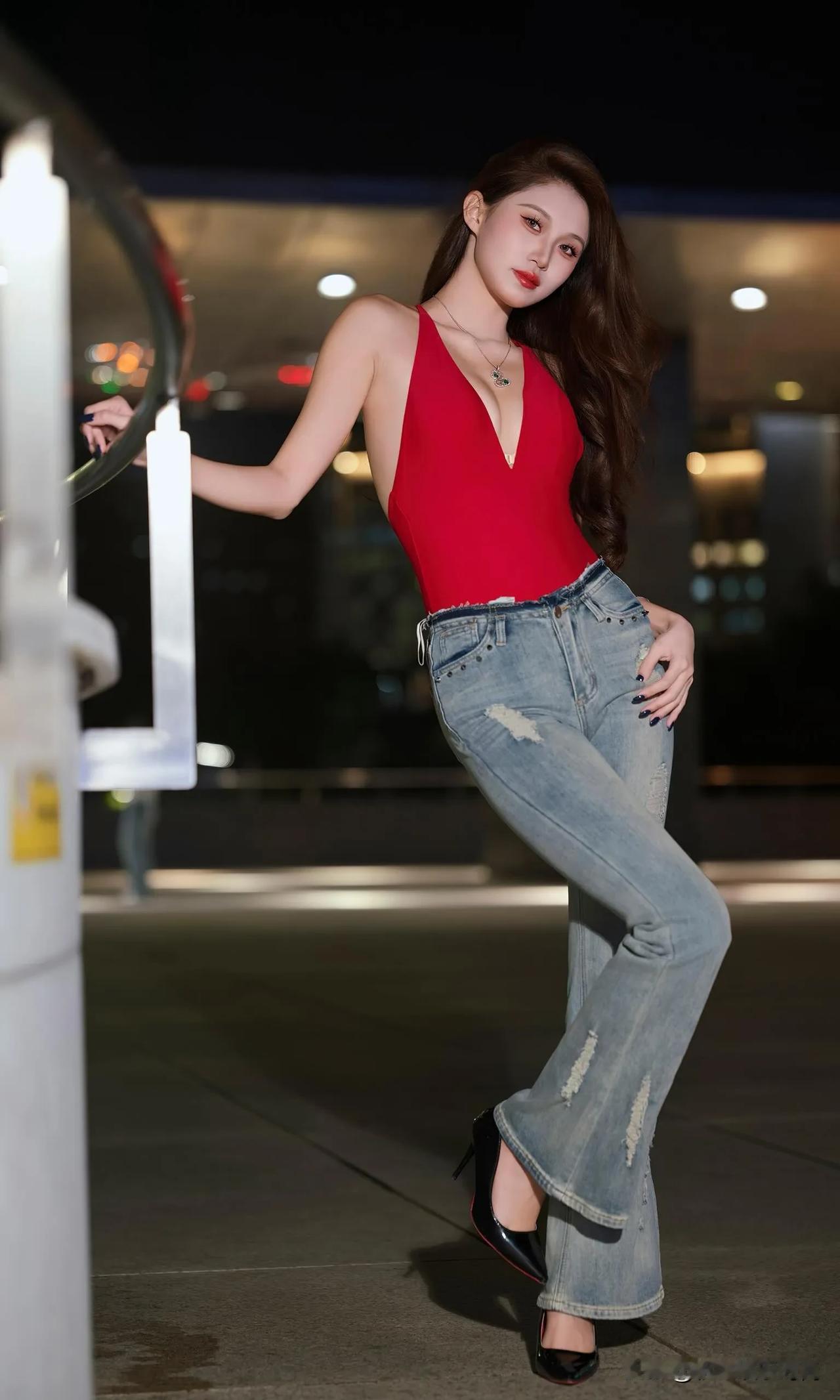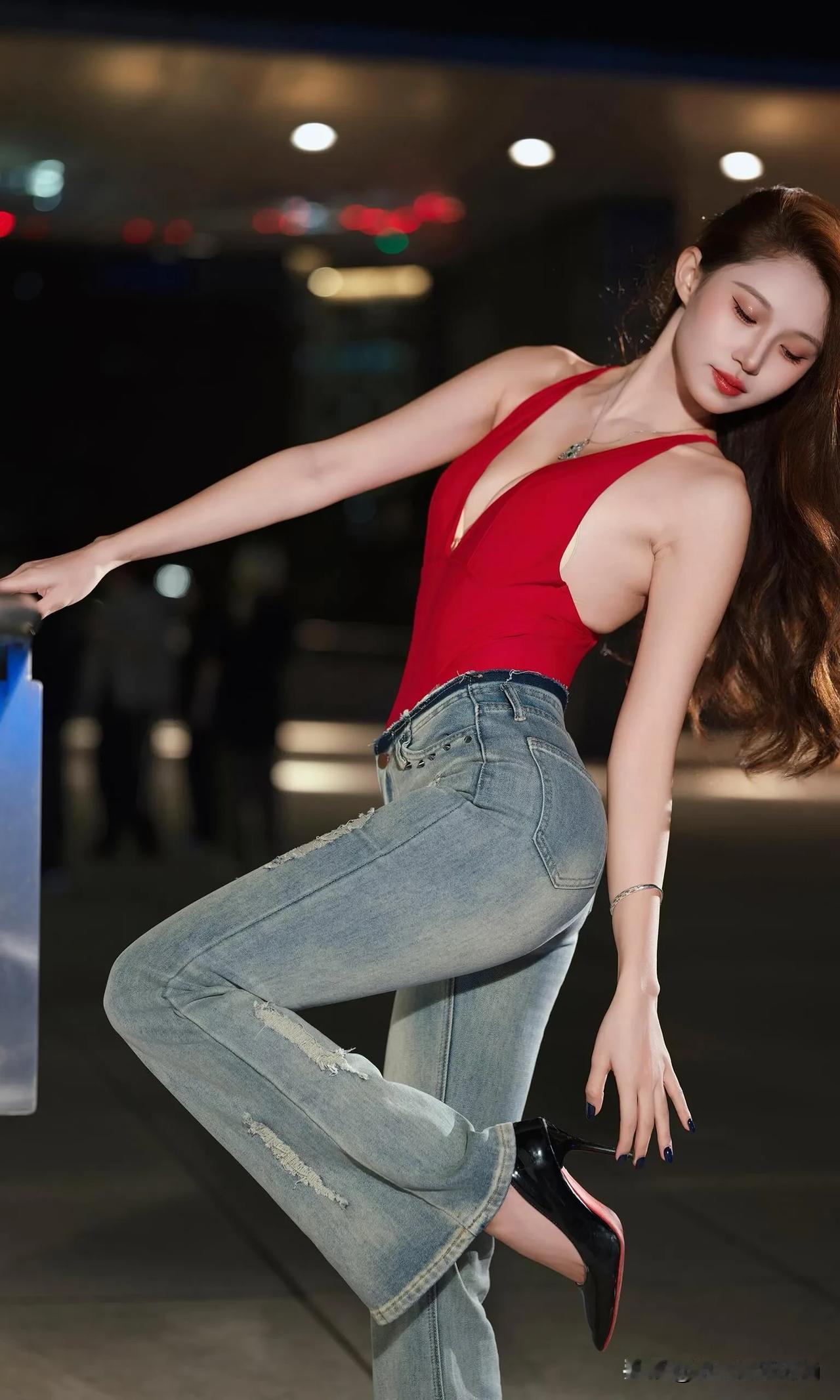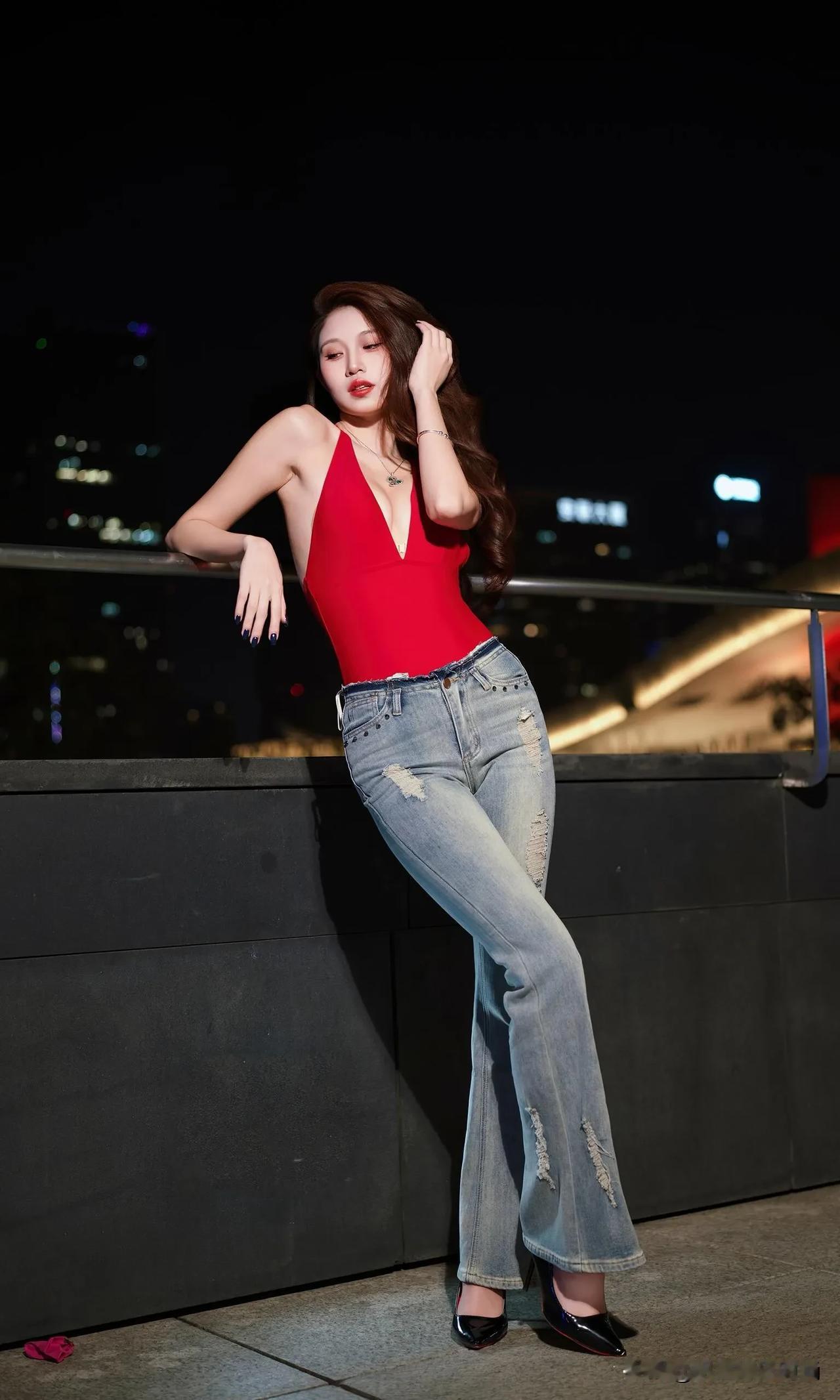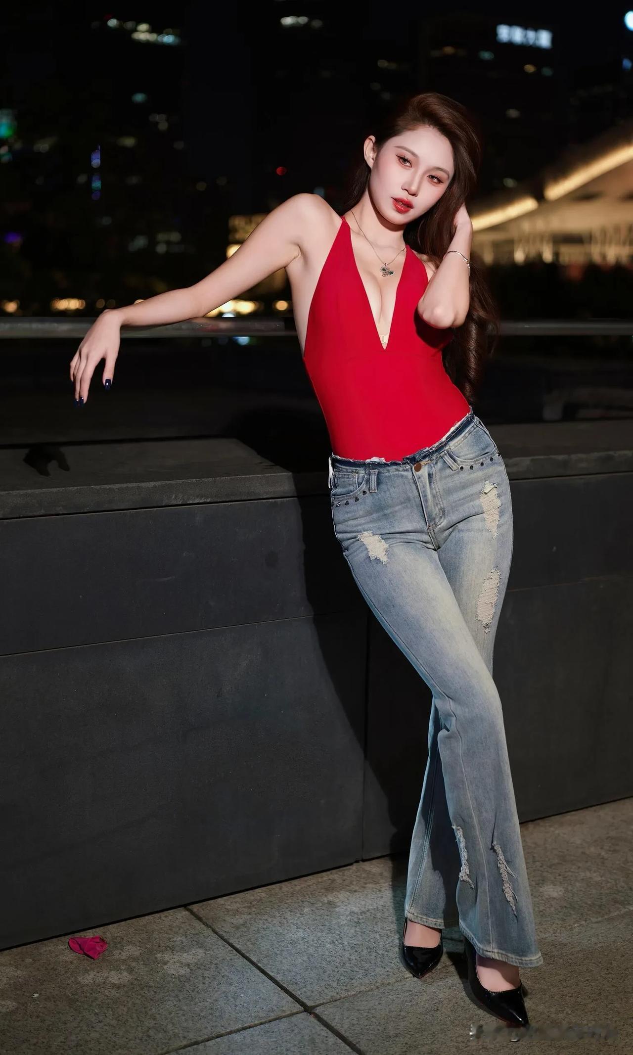 这身辣妹装着实性感,她宛如暗夜中绽放的红玫瑰。正红色深V挂脖连体衣,大胆地展露肩颈与精致锁骨,勾勒出曼妙的身姿曲线,热烈如燃烧的火焰,瞬间吸引众人目光。 搭配做旧破洞微喇牛仔裤,复古水洗蓝与个性破洞相互碰撞,中和了上衣的明艳张扬,增添了几分随性不羁之感。微喇裤型还悄然拉长腿部线条,让身姿愈发高挑。 脚踩黑色尖头高跟鞋,利落的尖头与闪耀的漆皮,为整体造型赋予了精致利落的气场,每一步都仿佛踏在时尚的节拍之上。 颈间的精致项链、腕间的细镯,还有深色美甲,这些细节之处的点缀,让这份辣妹风情更具层次感。在都市夜景的映衬下,她无疑是街头最亮眼的存在,将热烈与酷飒完美融合,演绎出独属于夜晚的时尚狂欢。
