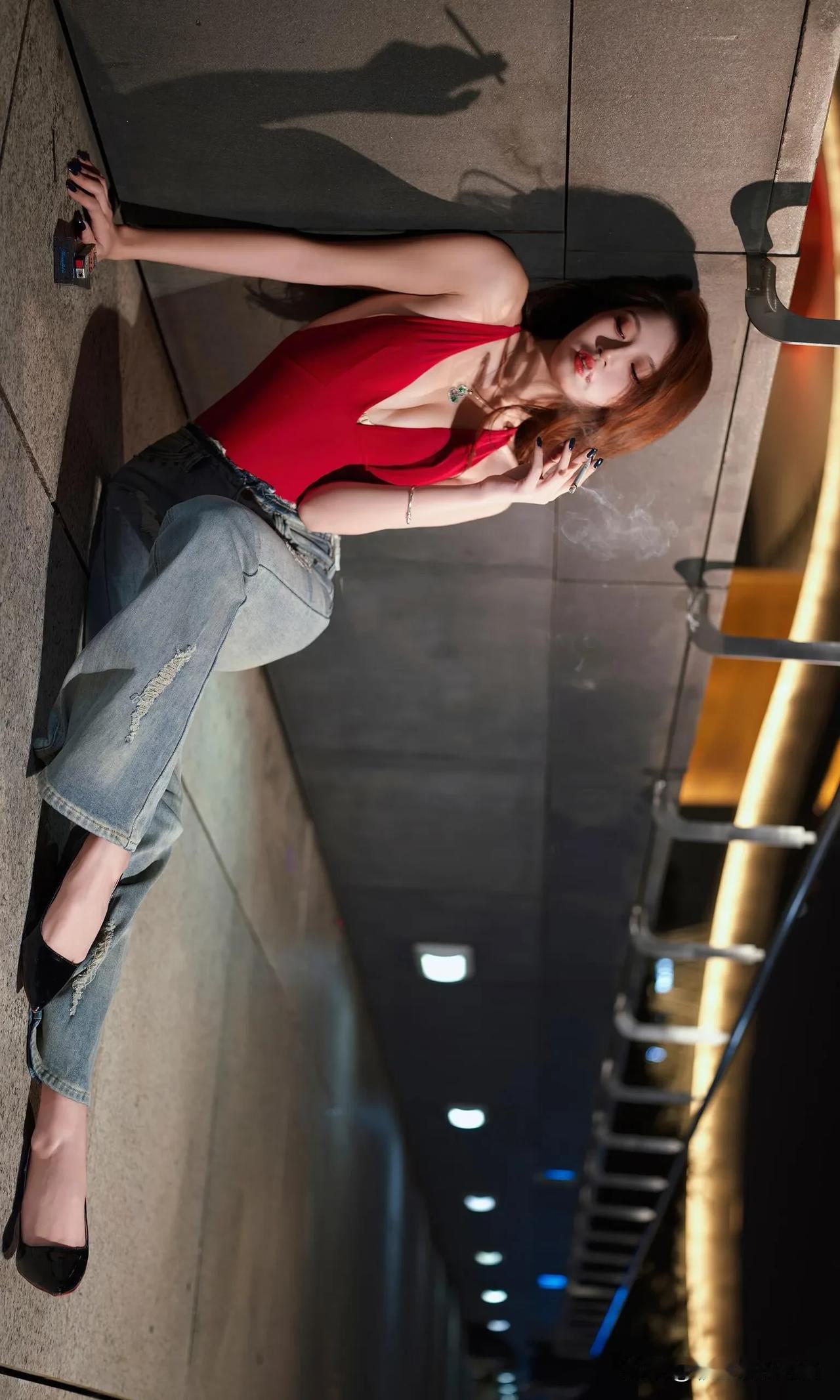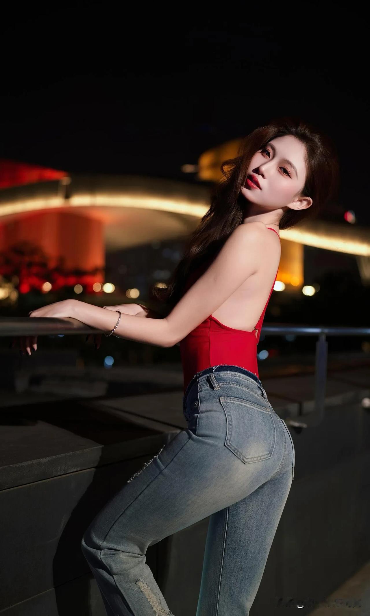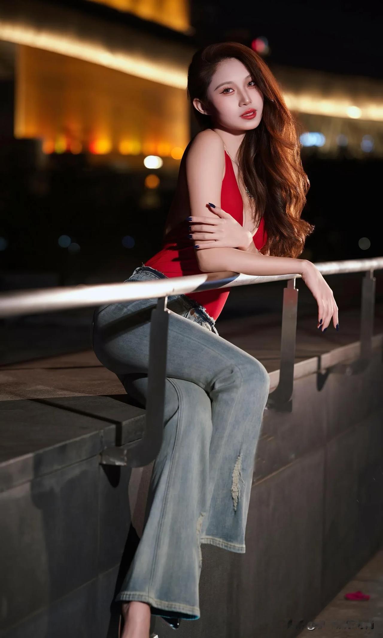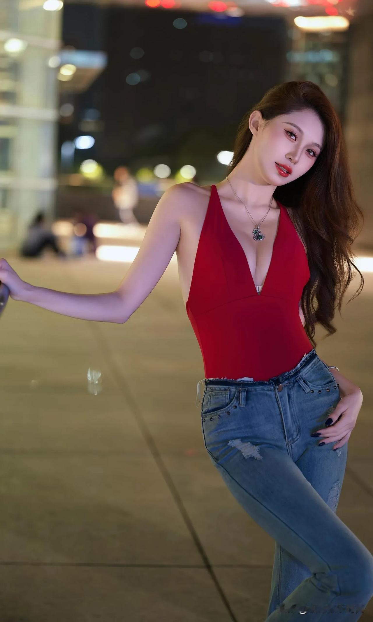 这身辣妹装着实性感,她宛如暗夜中绽放的红玫瑰。正红色深V挂脖连体衣,大胆地展露肩颈与精致锁骨,勾勒出曼妙的身姿曲线,热烈如燃烧的火焰,瞬间吸引众人目光。 搭配做旧破洞微喇牛仔裤,复古水洗蓝与个性破洞相互碰撞,中和了上衣的明艳张扬,增添了几分随性不羁之感。微喇裤型还悄然拉长腿部线条,让身姿愈发高挑。 脚踩黑色尖头高跟鞋,利落的尖头与闪耀的漆皮,为整体造型赋予了精致利落的气场,每一步都仿佛踏在时尚的节拍之上。 颈间的精致项链、腕间的细镯,还有深色美甲,这些细节之处的点缀,让这份辣妹风情更具层次感。在都市夜景的映衬下,她无疑是街头最亮眼的存在,将热烈与酷飒完美融合,演绎出独属于夜晚的时尚狂欢。