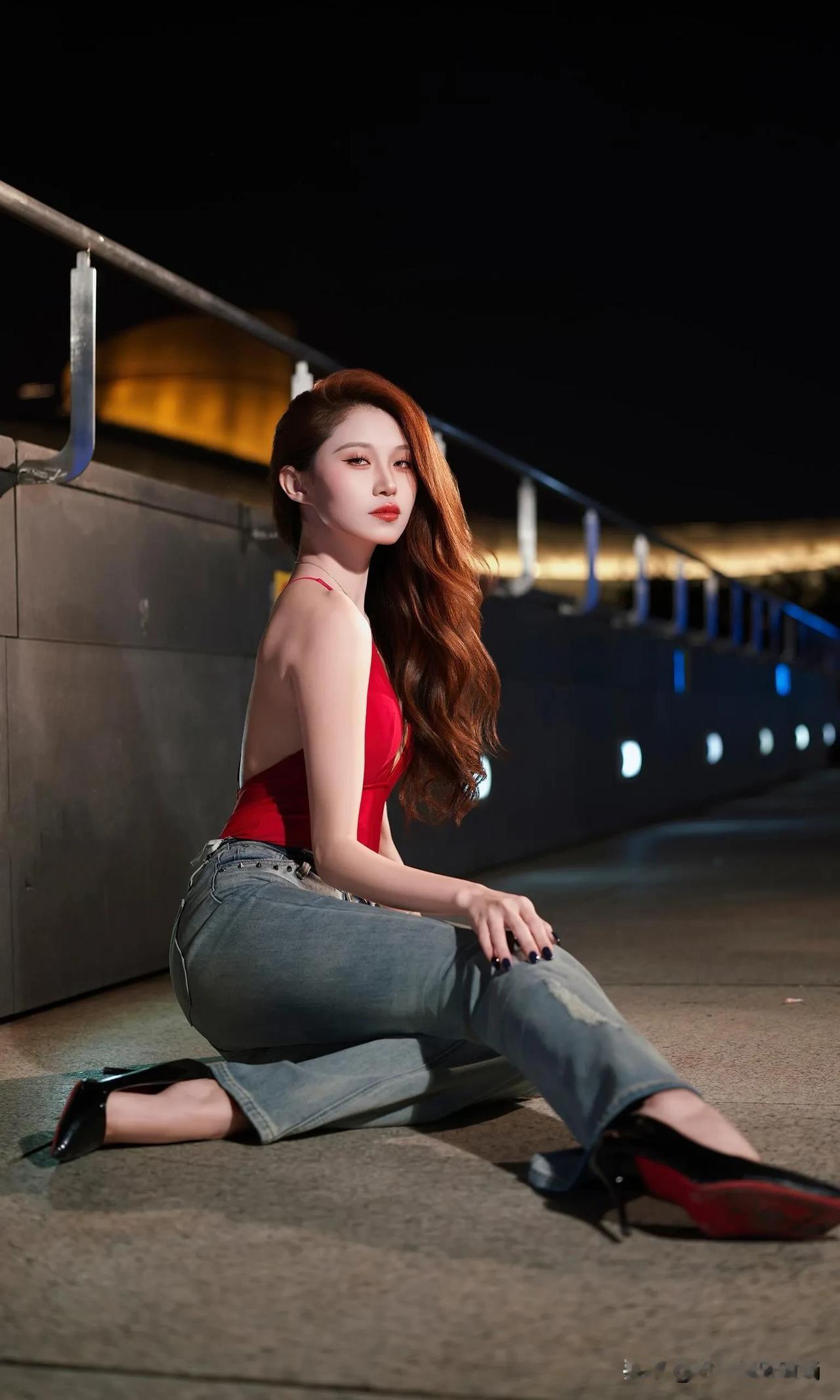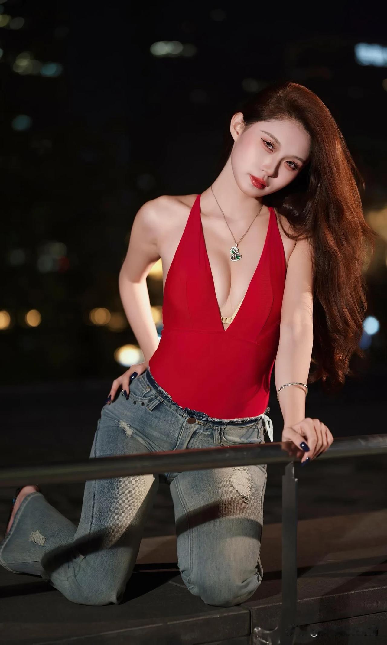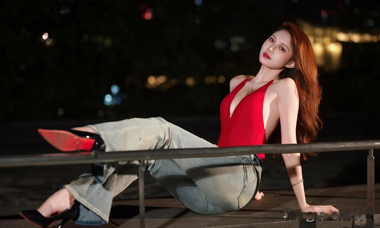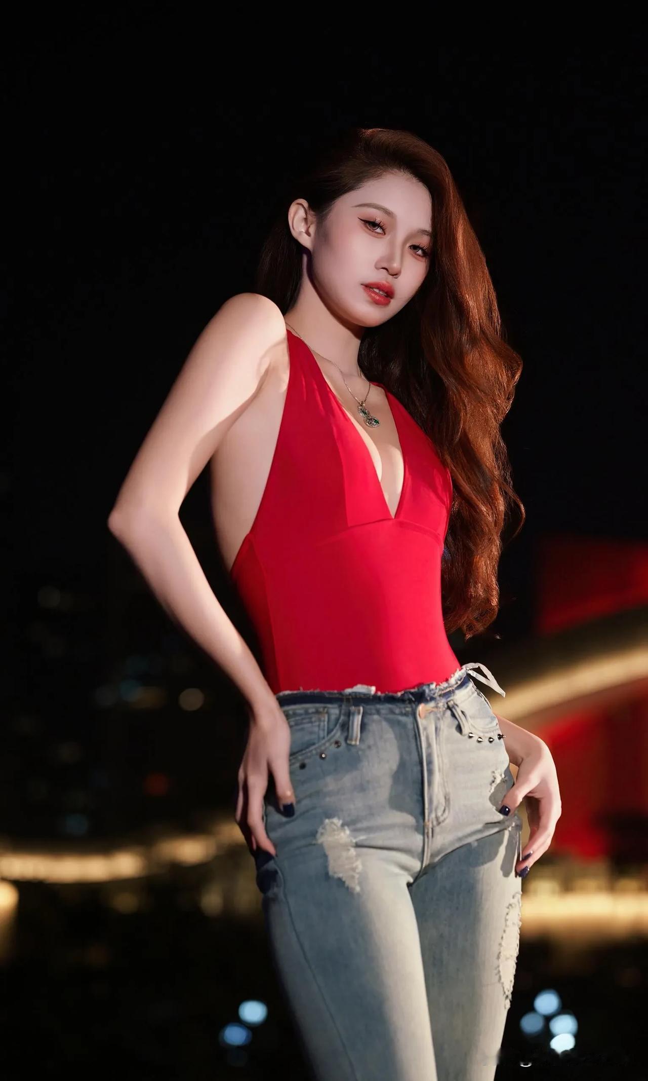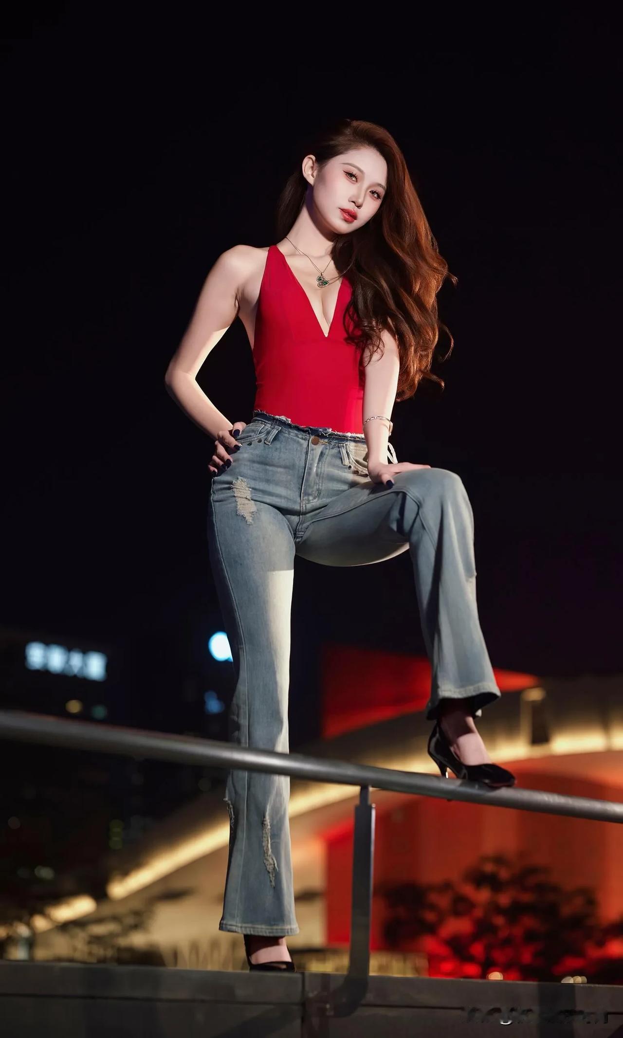这身穿搭热情奔放又自在随性,独特魅力尽显无遗。她身着一件大红色深V吊带连体衣,那明艳的红色瞬间吸引目光,深V设计大胆且性感,完美勾勒出迷人的身材曲线,吊带款式又增添了几分干脆利落与肆意张扬。 下装搭配一条浅蓝色破洞牛仔裤,经典的牛仔面料自带休闲随性的气质,破洞元素为整体造型注入了潮流感与不羁范儿,与上衣的热烈形成了一种妙趣横生的平衡。 脚上踩着一双黑色高跟鞋,在提升气场的同时,让腿部线条更显修长。配饰方面,一条带有精美装饰的项链点缀在颈部,增添了一丝精致韵味,手腕上的细手链则在细节处让造型更加丰富。 整体穿搭将性感、休闲、潮流巧妙融合,在夜色的映衬下,更显风情绰约,仿佛在诉说着一种自由且热烈的生活态度。