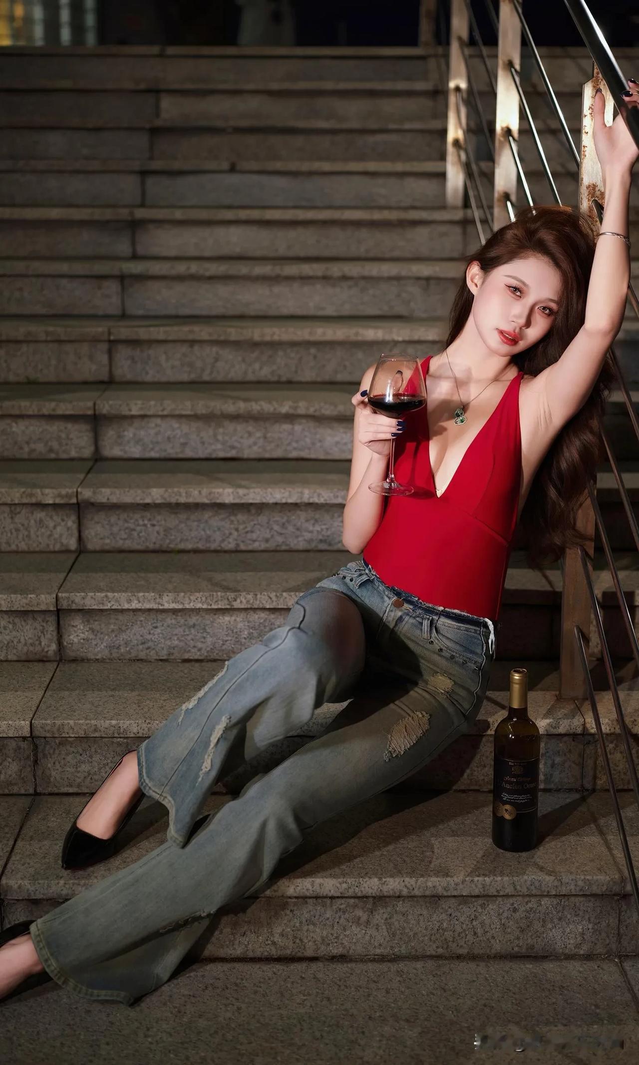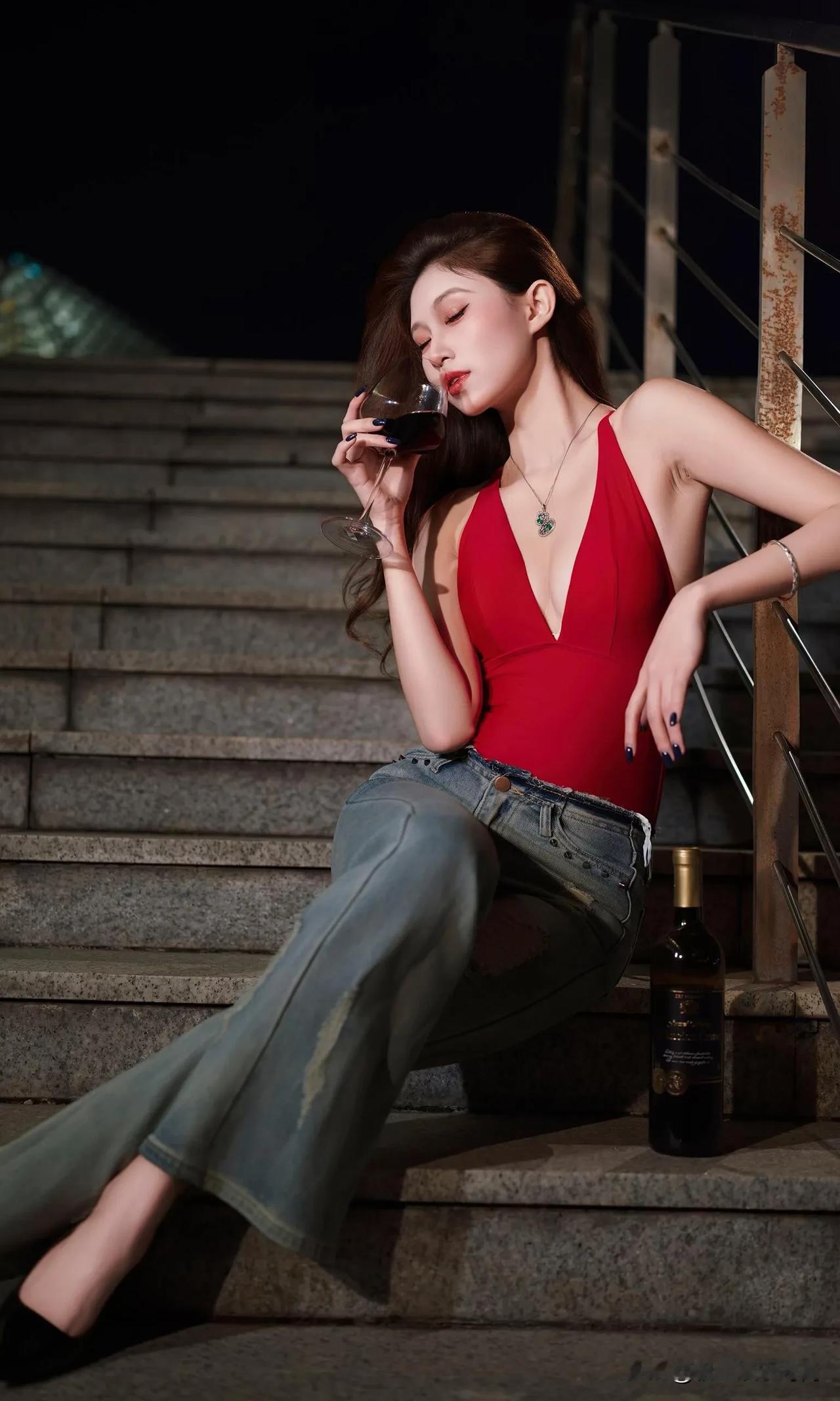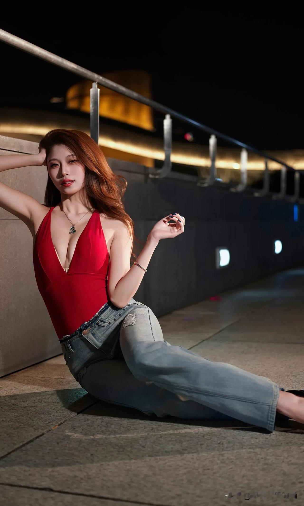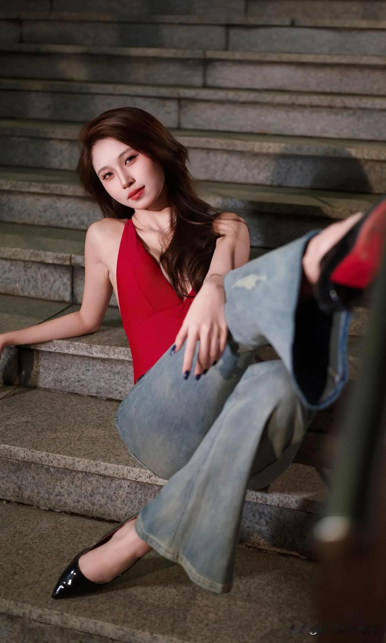 这身穿搭热情奔放又自在随性,独特魅力尽显无遗。她身着一件大红色深V吊带连体衣,那明艳的红色瞬间吸引目光,深V设计大胆且性感,完美勾勒出迷人的身材曲线,吊带款式又增添了几分干脆利落与肆意张扬。 下装搭配一条浅蓝色破洞牛仔裤,经典的牛仔面料自带休闲随性的气质,破洞元素为整体造型注入了潮流感与不羁范儿,与上衣的热烈形成了一种妙趣横生的平衡。 脚上踩着一双黑色高跟鞋,在提升气场的同时,让腿部线条更显修长。配饰方面,一条带有精美装饰的项链点缀在颈部,增添了一丝精致韵味,手腕上的细手链则在细节处让造型更加丰富。 整体穿搭将性感、休闲、潮流巧妙融合,在夜色的映衬下,更显风情绰约,仿佛在诉说着一种自由且热烈的生活态度。