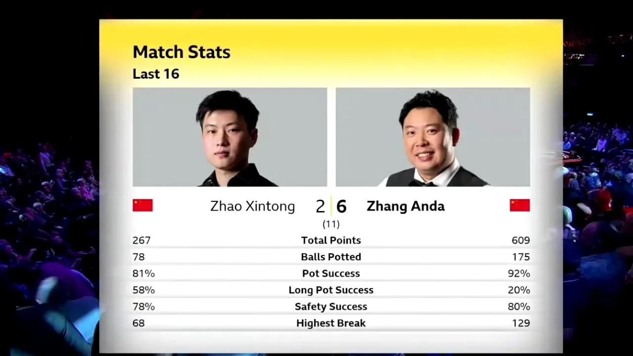 赵心童德比惨败不敌张安达!这比赛完全就是一边倒,张安达手感炸裂,连续的单杆破百打的赵心童毫无还手之力,数据体现的淋漓尽致,新科世锦赛冠军第二轮便被淘汰出局,八强目前有两位张安达加上庞俊旭,谁能夺冠便能重返世界前十六?