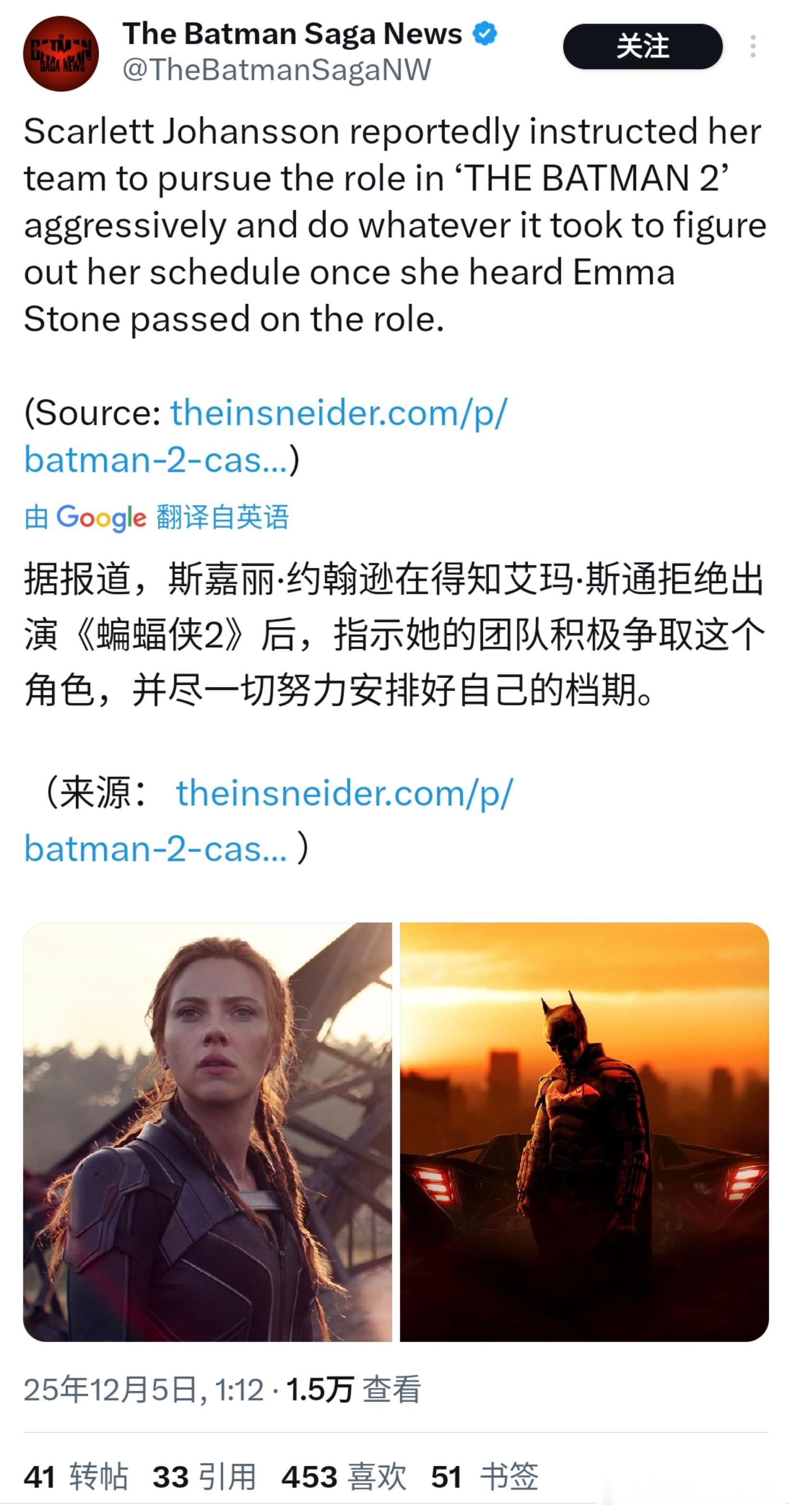 据报道,艾玛·斯通(Emma Stone)曾拒绝出演《蝙蝠侠 2》(THE BATMAN 2),之后片方才接触了斯嘉丽·约翰逊(Scarlett Johansson)。而斯嘉丽·约翰逊在听说艾玛·斯通拒绝了《蝙蝠侠 2》的角色后,立刻指示她的团队积极争取该角色,并想方设法解决她的档期问题。