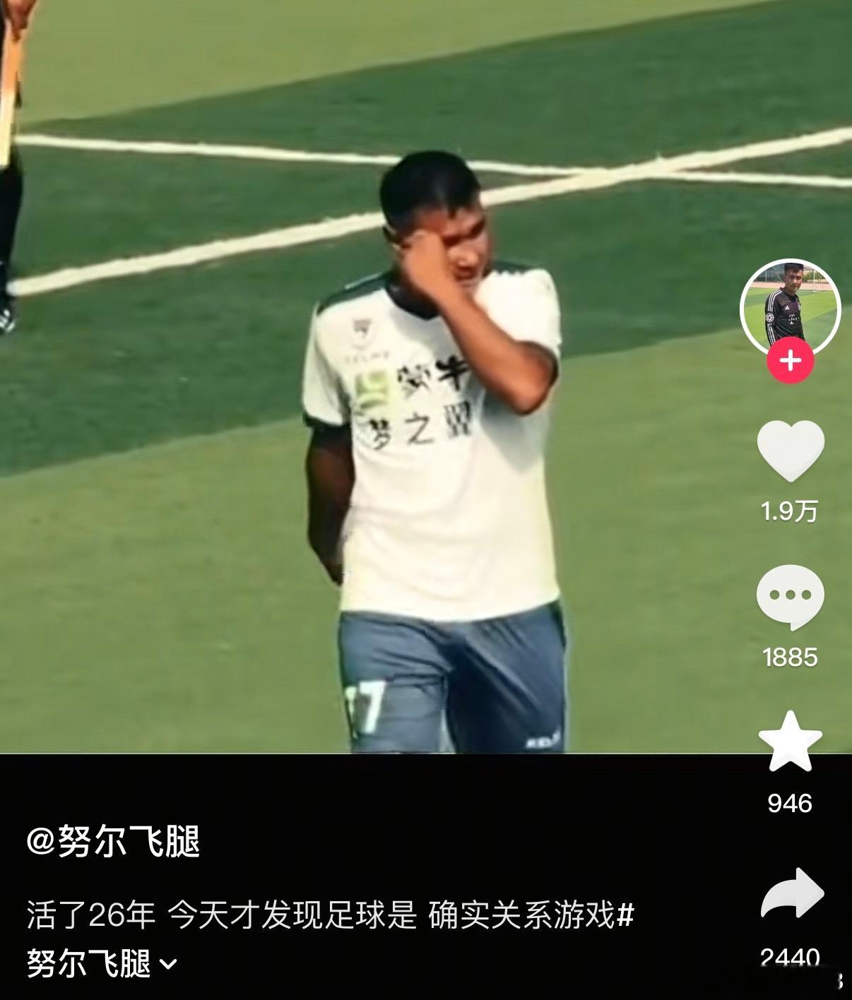 新疆知名网红球员努尔飞腿,代表兰州买哥队参加喀什杯,首发10分钟被换下场,泪洒赛场,在个人社媒直言,足球就是关系的游戏,并表示明年要自己组支球队参赛