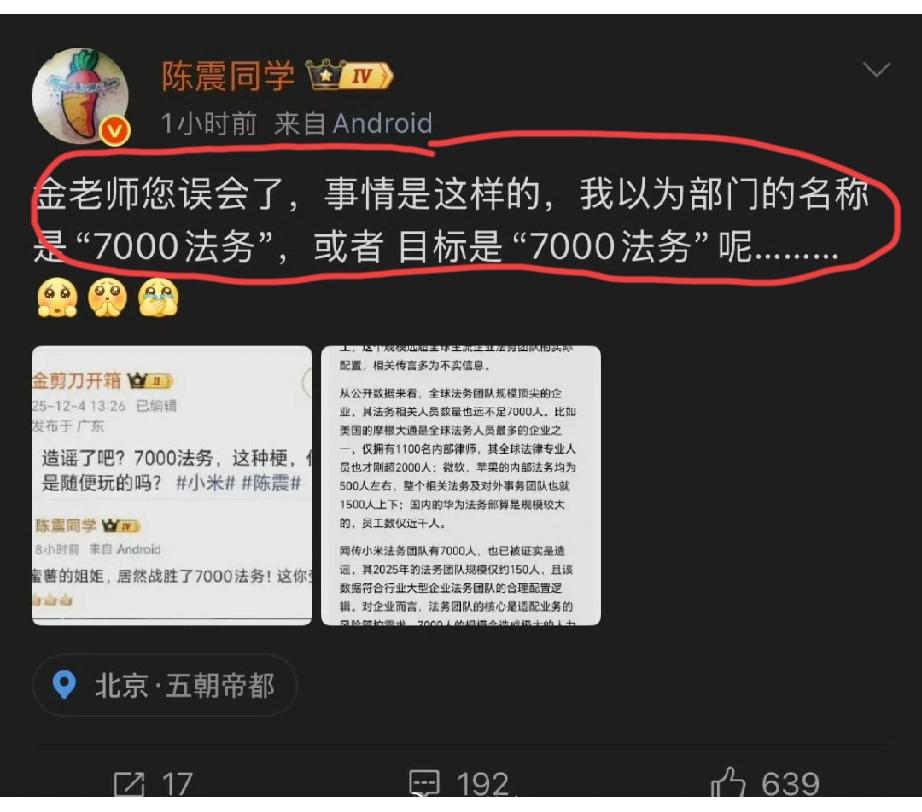 就在刚刚,说车大V“陈震同学”也被全网禁言了,而至于为什么会被禁言,网友纷纷猜测是因为他说某米公司有“7000法务”。 近期,陈震多有说某米公司的好话,可这有什么总呢?他以往太多阴阳某米公司和创始人的小作文了。现在人家就抓住他说错话这一点,直接把他摁在了水中一顿胖揍! 不管是什么原因,让我们拭目以待他还能不能回来吧!