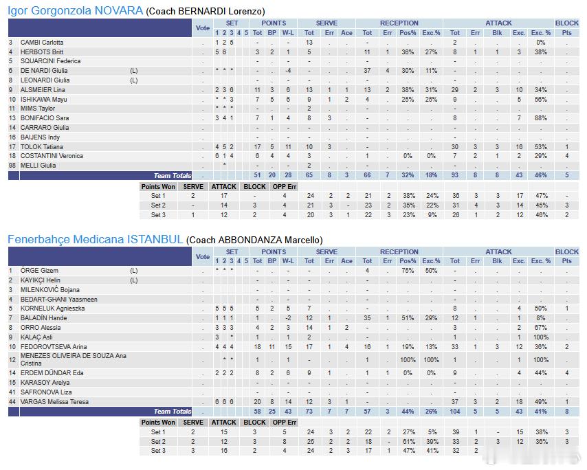 【诺瓦拉完败费内巴切,瓦尔加斯MVP20分】女排欧冠 第二轮正赛,诺瓦拉主场迎战费内巴切,赛前费内巴切放烟雾弹,主二传奥罗首发出场,最终诺瓦拉0-3完败费内巴切,费内首发:奥罗包姐跑娃神灯艾达奥格瓦尔加斯安娜本场也伤愈复出;诺瓦拉首发:托洛克、赫伯茨阿尔斯迈尔博尼法西奥等;三局比分23-25/21-25/19-25;MVP瓦尔加斯20分(37扣18中3失误2被拦1拦1发)跑娃18分(33扣12中1失误3被拦2拦4发16一传1失误)艾达8分(9扣4中4拦)包姐5分(8扣4中1拦)奥罗4分(3扣2中2发)安娜1分(1扣1中)神灯1分(12扣1中1失误35一传1失误)卡拉奇1分(1扣1中)世界女排新闻 托洛克17分(30扣16中3失误3被拦1拦)阿尔斯迈尔11分(29扣10中1发2失误3被拦13一传2失误)石川真佑7分(9扣5中2发4一传)博尼法西奥7分(8扣7中)维罗妮卡6分(7扣2中2失误1被拦4拦)赫伯茨3分(8扣3中1失误1被拦11一传1失误)