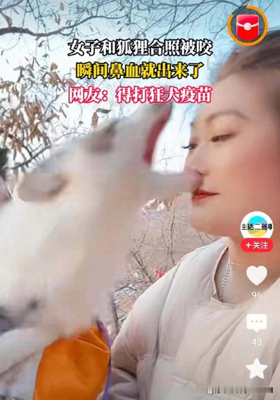 女子刷视频时看到卧龙山仙狐洞,说有两只灵狐还能拍照,便和朋友前往。没想到,第一次与狐狸亲密接触,她就被咬伤了。所幸伤口仅在鼻孔内侧,虽流了血,但其他部位躲过一劫,并未受伤。 狐狸主人称狐狸都打过疫苗,女子觉得只是小伤口,接受了赔偿便没去打疫苗。回家后,她回看录像,心里不禁有些后怕,心想若脸上留疤,定会后悔终生。 网友表示,狐狸与女子有缘,不会在她脸上留疤。狐狸看了女子一眼便开始咬她,毕竟动物不像人能控制脾气,所以要远离不熟悉的动物。 还有网友吐槽,女人的想法很奇怪,见什么动物都要合照。看到猫狗这类毛茸茸的动物就想伸手去摸,真是自讨苦吃、活该。
