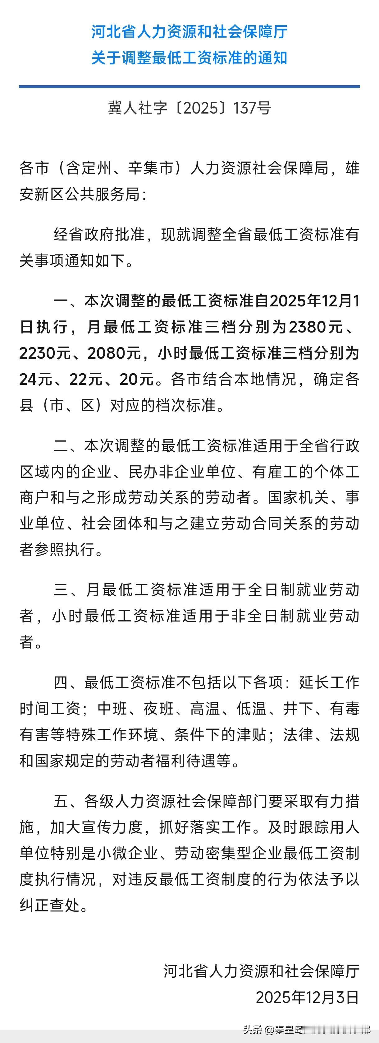 📣【河北打工族速看!12月起工资要涨了!】河北省最低工资标准上调了!文件是12月3日刚发的,但执行日期从12月1日就算起,也就是说,这个月发工资就能瞅瞅账上有没有变化! 💰具体涨了多少? - 月工资三档:2380元、2230元、2080元(此前老标准是2200、2000、1800元) - 小时工三档:24元、22元、20元(原来分别是22元、20元、18元) 虽然各市具体对应哪档还没细说,但秦皇岛往年规律是:海港区、山海关区、北戴河区、抚宁区、开发区这些城区一般按一档走,昌黎、卢龙、青龙等县可能对应二档。这次调完,像海港区的小伙伴底薪起码能多180块以上! ⚠️但注意! 最低工资不含加班费、夜班补贴、高温津贴这些,老板要是把补贴也算进“底薪”凑数,可是违规的! 说实话,这年头工作不好找,有人吐槽“肯德基一小时才13块2”,也有人觉得“有稳定收入就不错了”。但底薪涨点,总归是好事——工资底子高了,加班费、社保基数、病假工资都能跟着往上挪一截,尤其是干销售、跑外卖的兄弟,底薪就是安全感! 目前全省已经发文要求重点查小微企业、劳动密集型企业落实情况。如果公司装傻不调整,直接保留工资条找人社局说道说道!打工人的权益,咱得自己盯紧了! (来源:河北省人社厅通知,2025年12月3日发布)