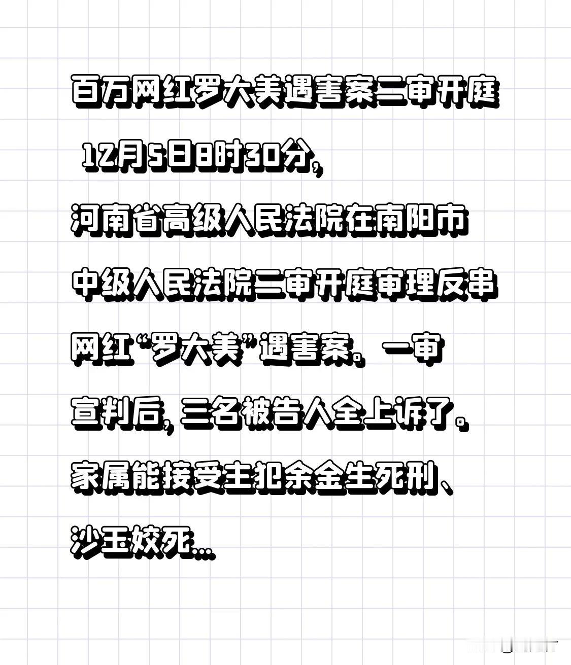 百万网红罗大美遇害案二审开庭 百万网红罗大美遇害案二审开庭 12月5日8时30分 河南省高级人民法院 在南阳市中级人民法院 二审开庭审理反串网红“罗大美”遇害案 一审宣判后 三名被告人全上诉了 家属能接受主犯余金生死刑、沙玉姣死缓 却觉得判杨恒有期徒刑十三年太轻 认为杨某也应是主犯 2023年7月 余金生因赌博缺钱 伙同沙玉姣、杨恒对“罗大美”下手 杨恒把人诱骗到余金生住处 他们绑了人还抢了二百多万 最后余金生杀害了“罗大美” 另外 凶手还用他花呗花了2.5万元 得家属偿还 希望二审能给家属和大众一个公正结果 罗大美 罗大美遇难 河南大美遇害 网红大美遇害案 网红残杀案
