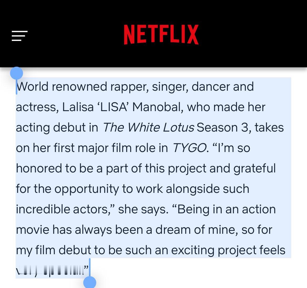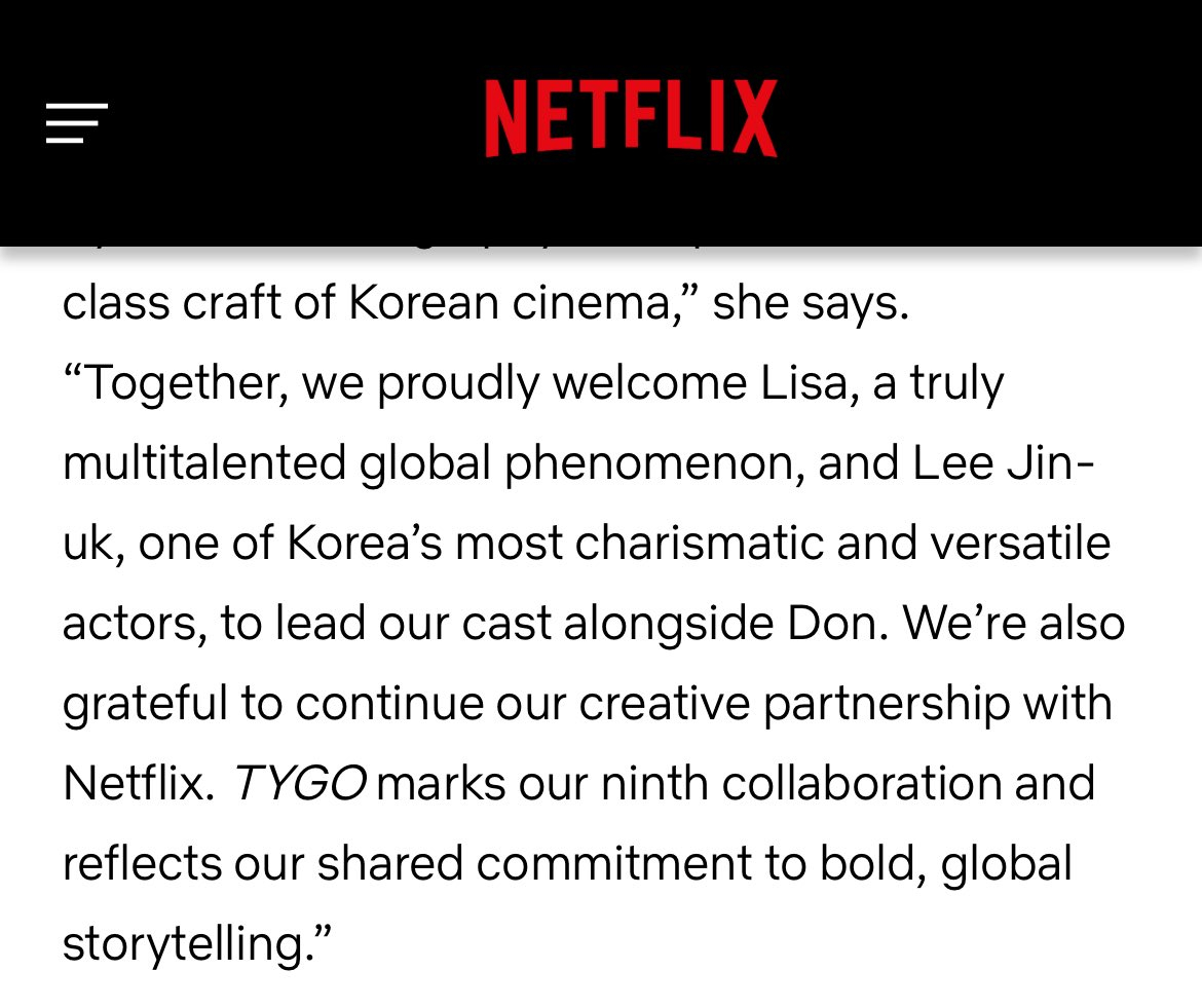 马东锡、李栋旭、LISA(Lalisa Manobal)主演《TYGO》:该片背景设定在《惊天营救》同一世界观中,讲述一名童兵出身的雇佣兵,在一次任务失败后,为寻仇而深入韩国地下世界的故事。即将登陆 Netflix。 LISA将饰演里亚一角。她是泰戈的挚友兼战友,两人自幼在危险境遇中相依为命,情同家人。在一次任务中,里亚不幸身陷险境。Netflix官方:国际知名说唱歌手、歌手、舞者兼演员拉莉莎·“丽莎”·马诺巴,在《白莲花度假村》第三季完成表演首秀后,将在电影《TYGO》中首次担纲重要角色。她表示:“能参与这个项目我深感荣幸,也很庆幸有机会与如此出色的演员们合作。参演动作电影一直是我的梦想,因此我的电影处女作能参与这样一部激动人心的作品,感觉格外特别。”“……我们在此荣幸欢迎LISA——一位才华横溢的全球性多栖艺人,以及韩国最具魅力与可塑性的演员之一李栋旭,他们将与马东锡共同领衔主演本片。同时,我们也衷心感谢与Netflix持续深化的创作伙伴关系。《TYGO》是我们双方的第九次合作,这亦彰显了我们对呈现宏大、全球化叙事作品的共同追求。”最后,LISA将饰演里亚一角。她是泰戈的挚友兼战友,两人自幼在危险境遇中相依为命,情同家人。在一次任务中,里亚不幸身陷险境。