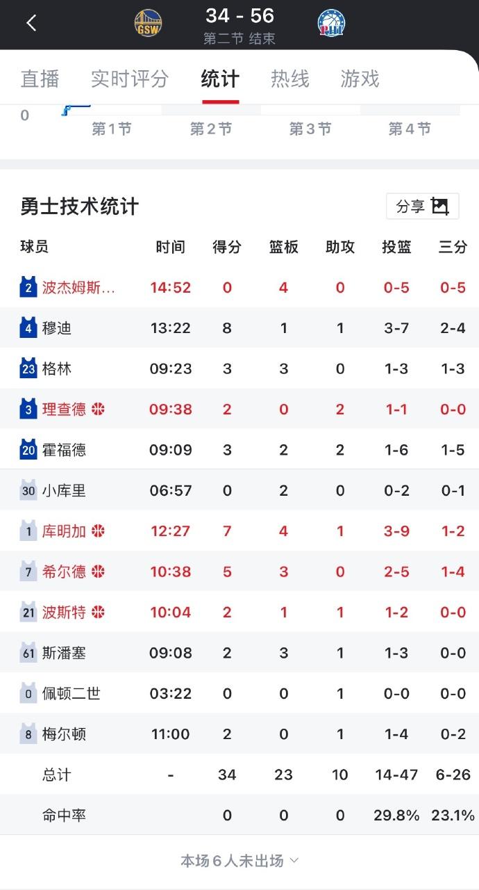 NBA:勇士再创得分记录! 北京时间12月5日NBA常规赛,正在进行的勇士客场挑战76人比赛中,半场结束,勇士34-56落后76人。勇士首节仅得10分,创本赛季联盟球队得分新低,也是科尔时代勇士历史单节最低分! 勇士被76人轰出22-0超级攻击波,单节仅得10分!对面的马克西一人就12分。