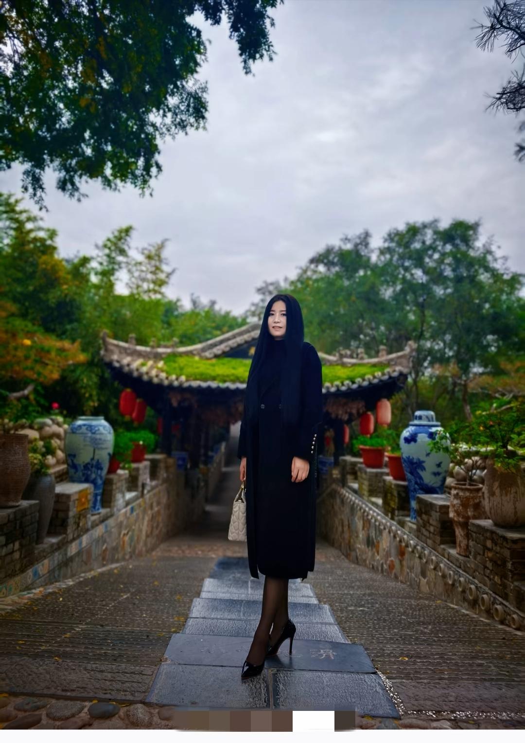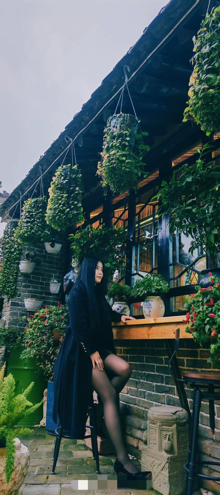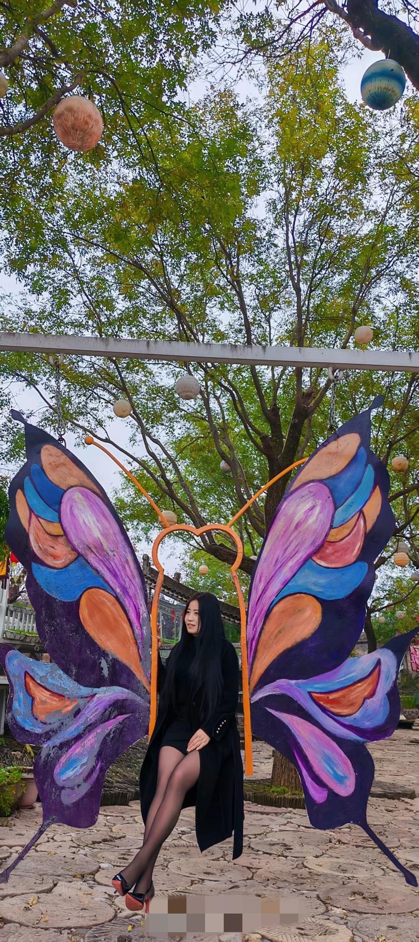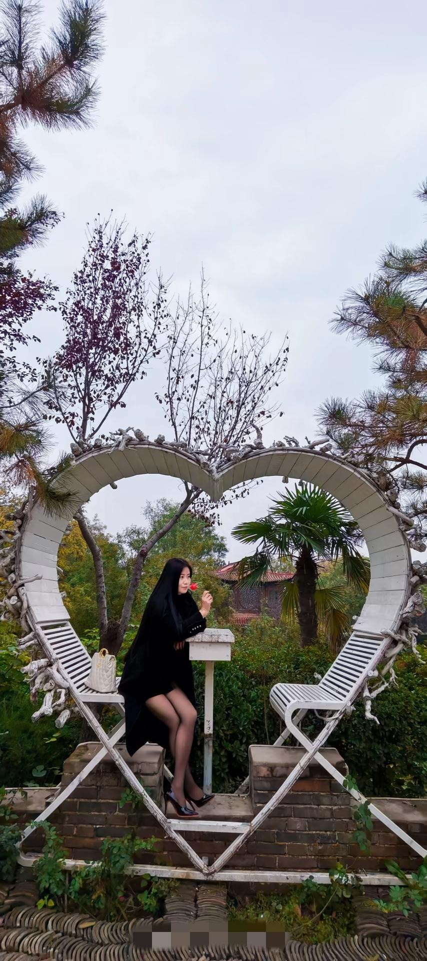 秋日森林中的优雅时光,黑衣女子坐在木制秋千上,静享宁静。御姐 高跟鞋 大长腿