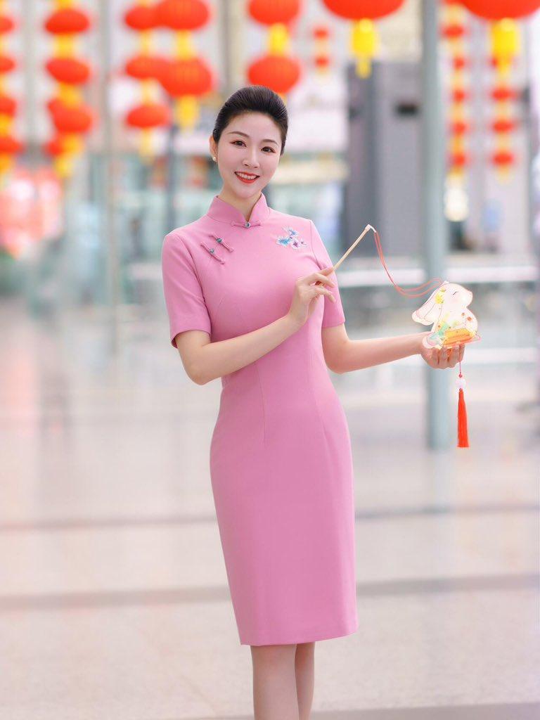 南航头等舱乘务长,粉色改良旗袍式制服#空姐