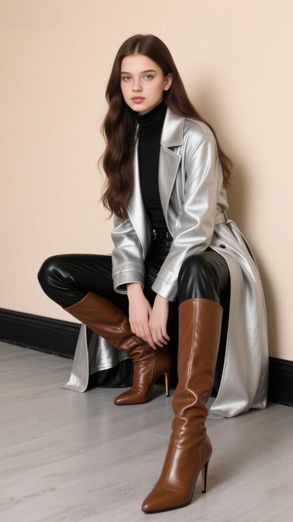 银色外套搭配黑色皮裤和棕色长靴,这组合简直是都市时尚的密码! 冬天穿衣容易踩坑,像穿厚羽绒变“鼓胀棉被人”、全黑穿搭显蜡黄没精神。但这套搭配就完美避开。银色外套亮眼又独特,打破冬日沉闷;黑色皮裤修身显瘦,凸显利落感;棕色长靴增添复古氛围,还能拉长腿部线条。 遵循三色原则,基础色黑色占比大,银色和棕色作为点缀,既不单调又有层次。走在都市街头,这一身穿搭尽显都市风范,让你轻松成为人群焦点。 如何搭配一套优雅的职业装?