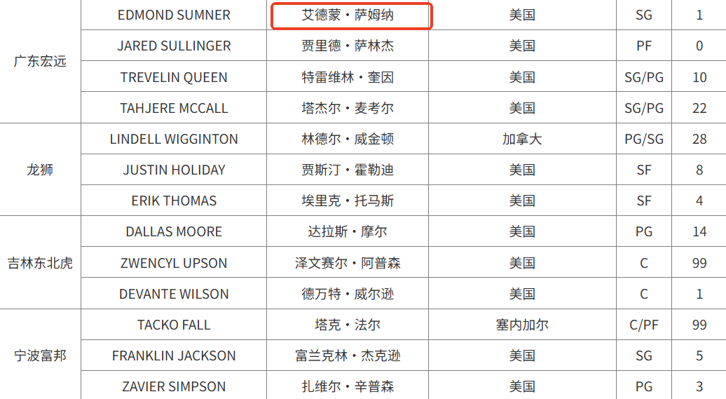CBA官方更新外援注册信息:广东男篮为萨姆纳完成注册