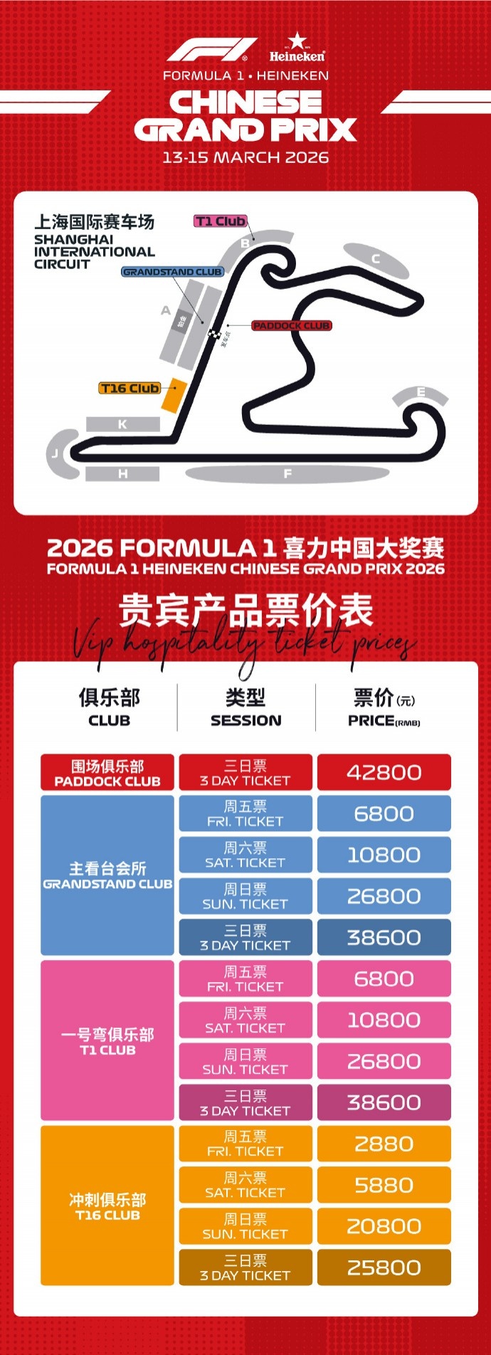 直播吧12月5日讯F1中国大奖赛官方公布2026年票价,最低380元,最高4680元。