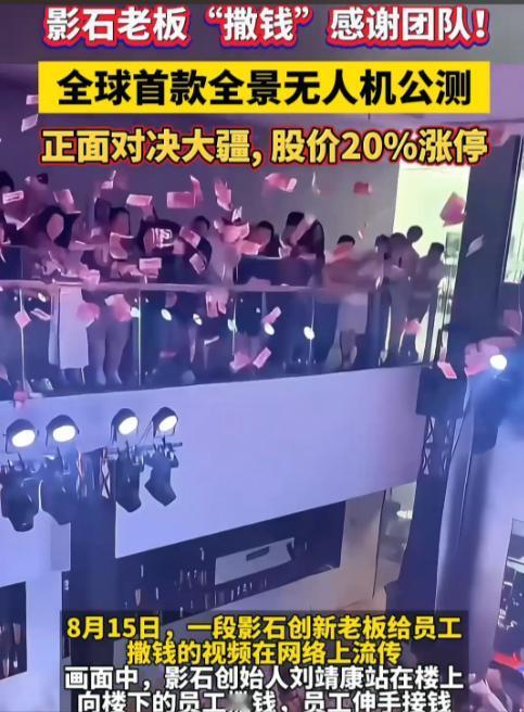 影石刘靖康:这次不敢撒钱了,改成尬舞发红包和分蛋糕。 据了解,12月4日晚,影石创新正式发售全球首款全景无人机影翎A1。发售仪式结束后,公司全员庆祝。 影石创始人刘靖康发文表示:这次不敢撒钱了,改成尬舞发红包和分蛋糕。[大笑] 此前,段影石创新老板刘靖康向员工撒钱的视频在互联网上传播并引发热议。