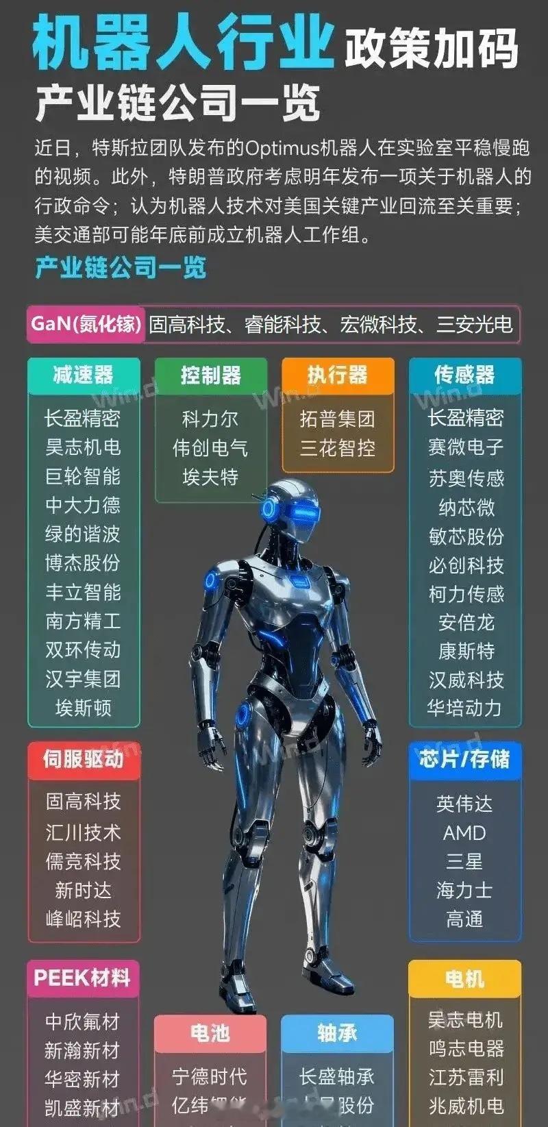 特斯拉Optimus正引入GaN工艺值的注意的是,机器人每一次工艺路线选择,相关标的将迎来一波上行期。GaN已开始大量用于机器人执行器、灵巧手等模块,ASP 或超万元;目前已知的是,宇树、智元和乐聚三家国内头部厂商旗下人形机器人和四足狗皆搭载GaN器件。从产业链层面,GaN器件公司分为上游的GaN功率器件(GaN芯片)公司和中游的GaN驱动器公司。值的注意的是,目前头部整机研发企业和聚焦核心部件的厂商已明确将氮化镓驱动器作为核心组件。GaN驱动是未来机器人运控性能提升的核心手段,近期特斯拉等厂商的PR视频体现了更强大的运控性能,得益于GaN驱动使得运控能力提升。(睿能科技、固高科技)如果拆开一台现代人形机器人的关节模块,你会看到传统硅基MOSFET已被氮化镓芯片取代。这种第三代半导体材料凭借其独特的性能优势,正成为机器人产业升级的关键推动力。固高科技推出的 GSFD 系列 GaN 驱动器,针对性适配人形机器人、工业机器人等对高频响应、小型化、高效能的核心需求。在产业化落地上,固高科技已实现超20万台GaN驱动器在工业机器人、半导体设备等领域的应用,产品的稳定性和可靠性经过大规模市场验证。GaN器件前五大厂商为英诺赛科、英飞凌、德州仪器、EPC、纳微,整体呈寡占格局。睿能科技是英飞凌国内分销商。除了GaN工艺外,陶瓷球和新的丝杠方案等也在炒作中。消息面上力星股份大概率要成为特斯拉人形机器人陶瓷球独家供应商了,人形机器人关节轴承垄断厂商,国内唯一陶瓷球技术大厂。大摩调查,高达62%中国企业或在三年内采用人形机器人。黄仁勋对马斯克正在研发的机器人感到无比兴奋。Figure 发布了旗下 F.03 人形机器人的跑步演示,该机器人的控制器由其内部Helix 团队开发的板载神经网络驱动。