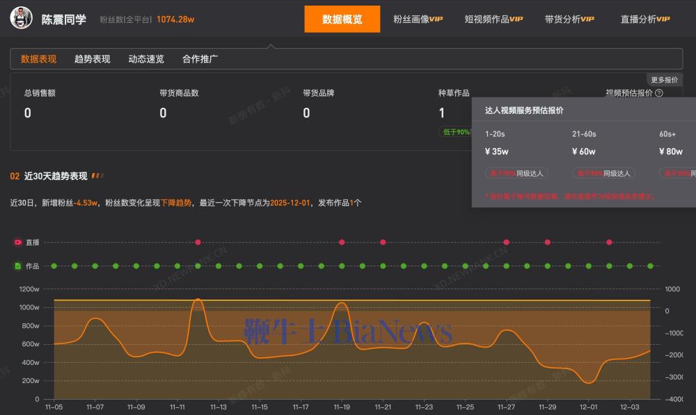 第三方数据显示,“陈震同学”视频平台近30日掉粉4.53万。此外,其1-20s视频广告报价为35万,21-60s视频广告报价为60万,60s以上视频广告报价为80万。