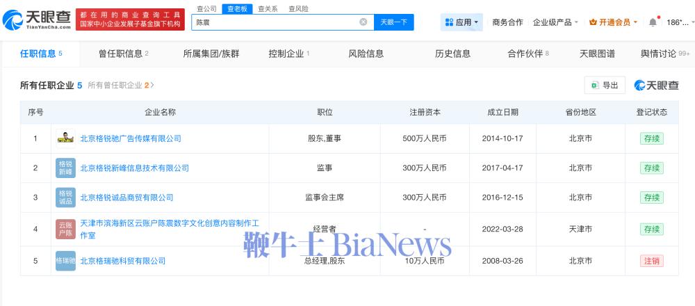 12月5日,天眼查App显示,陈震名下共关联5家企业,其中4家为存续状态,包括北京格锐驰广告传媒有限公司、北京格锐新峰信息技术有限公司等,陈震在上述企业中担任监事等职务,版图涉及广告传媒、商贸等领域。