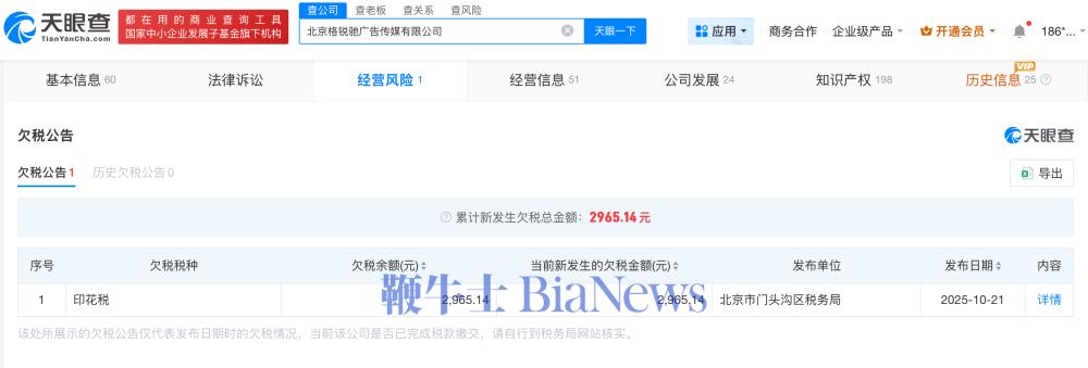 此外,陈震名下北京格锐驰广告传媒有限公司现存1则欠税公告,欠税余额2965.14元,欠税税种为印花税。