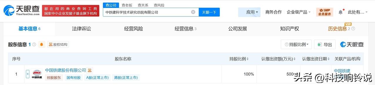 【中铁建科学技术研究总院公司成立 注册资本5亿】 天眼查工商信息显示,近日,中铁建科学技术研究总院有限公司成立,法定代表人为张国峰,注册资本5亿人民币,经营范围含工程和技术研究和试验发展、新材料技术研发、新材料技术推广服务、科技中介服务、人工智能公共服务平台技术咨询服务、信息咨询服务、人工智能基础资源与技术平台、物联网技术服务、储能技术服务等。股东信息显示,该公司由中国铁建(601186)全资持股。 天眼查信息: