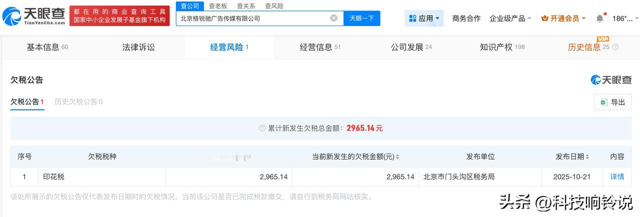 【陈震名下公司因欠税被公告 陈震1分钟视频报价80万】陈震多平台被禁言 据报道,12月4日晚,“陈震同学”多平台账号被禁言。 第三方数据显示,“陈震同学”视频平台近30日掉粉4.53万。此外,其1-20s视频广告报价为35万,21-60s视频广告报价为60万,60s以上视频广告报价为80万。 天眼查App显示,陈震名下共关联5家企业,其中4家为存续状态,包括北京格锐驰广告传媒有限公司、北京格锐新峰信息技术有限公司等,陈震在上述企业中担任监事等职务,版图涉及广告传媒、商贸等领域。此外,陈震名下北京格锐驰广告传媒有限公司现存1则欠税公告,欠税余额2965.14元,欠税税种为印花税。 天眼查信息:-c115417283