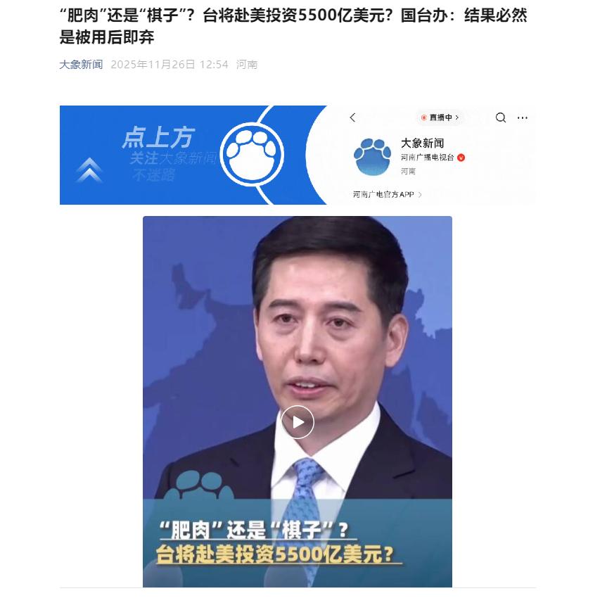 国台办警告:如属实,岛内将遭毁灭性打击! 朱凤莲指出:台湾在美投资接近3500亿至5500亿美元,约占台湾生产总值的44%到69%,约占台湾今年10月外汇储备的58%到92%。 这不是天文预算,而是民进党当局打算押给美国的投名状,是台湾人的血汗钱! 前两年美国逼着台积电去亚利桑那州建厂,说是"供应链安全",结果呢?台湾工程师拖家带口过去,发现厂房漏水、设备生锈,美国工人根本玩不转精密技术。现在好了,美国连整个供应链都要"连锅端",从芯片设计到封装测试,全得搬到美国去。 民进党当局还在说"自愿合作",可台湾业界都明白,这跟当年列强在中国划租界有啥区别?台积电创始人张忠谋都说,美国建厂是"浪费钱",可民进党不敢不听美国的,毕竟他们要的是"台独"护身符,不是台湾人的饭碗。 再算笔细账,台湾去年半导体产业占GDP的18%,就业人口超过50万。如果按照美国要求,把这些产业的核心产能和研发团队迁到美国,台湾剩下的只有空壳子。就像高雄的半导体工厂,原本周边围着上百家配套企业,一旦搬走,整条产业链就得散架。 桃园的科技园区,多少年轻人熬夜加班攒下的技术,最后都成了美国公司的专利。更狠的是,美国还要求台湾开放农业市场,说是"对等关税",结果呢?台湾农民的凤梨卖不出去,美国的转基因玉米一车车进来,这哪是合作,分明是抽血。 民进党当局为啥这么痛快?看看他们的操作就明白。去年台美签署"21世纪贸易倡议",台湾答应开放美猪美牛,连莱克多巴胺的残留标准都照搬美国的。现在关税谈判,美国说"不交钱就加税",民进党立刻把3500亿的投资协议塞进"机密预算",连立法院都不让细查。 有台湾议员爆料,谈判文本里居然有"台湾不得与大陆进行关键技术合作"的条款,这哪是谈生意,分明是签卖身契。 最惨的是台湾老百姓,新北市的电子厂工人,本来指着台积电的订单养家,现在厂子要搬美国,饭碗眼看保不住。台中果农去年刚赔本砍掉香蕉树改种凤梨,今年美国农产品进来,价格直接腰斩。 更不用说年轻人,台湾的科技业薪资十年没涨,现在连工作机会都要被美国拿走。前几天高雄游行,有个老阿嬷举着牌子:"民进党拿我们的钱买美国的枪,子弹却要我们的孩子挡!" 美国的算盘打得精,他们知道台湾的半导体是大陆的"软肋",所以一边用关税逼民进党交钱,一边掏空台湾的产业根基。就像当年日本的半导体产业,被美国用《广场协议》整垮,现在轮到台湾。不同的是,日本还有国家主权,台湾呢?民进党当局连谈判的底气都没有,美国说"五五分",他们就敢签"三七开",最后连骨头都不剩。 台湾工商界早就看穿了,台湾工业总会去年就警告,对美投资超过2000亿就会"产业空洞化",现在直接翻倍。鸿海的郭台铭公开说:"把鸡蛋全放进美国篮子里,早晚要碎。"可民进党听不进去,他们算的是政治账,只要美国承认"台湾地位",哪怕台湾变成空壳子也无所谓。就像台南的渔民说的:"他们开的是装甲车,我们划的是小舢板,浪来了先沉的是我们。" 国台办说的"毁灭性打击"不是吓唬人。看看数据,台湾今年前三季度对美投资暴涨46%,大部分都是半导体企业被迫转移。新竹科学园区的写字楼空置率创五年新高,而亚利桑那州的台湾工程师社区,房价一年涨了30%。这些钱要是留在台湾,能建多少学校、医院?能给多少老人涨养老金?现在全成了美国的"保护费",换来的却是台海越来越紧张的局势。 最讽刺的是,美国一边拿台湾的钱,一边卖过期武器给台湾。去年台湾买的"鱼叉"导弹,生产日期是2008年的,民进党当局还说是"最新锐"。高雄港的退役军舰,锈迹斑斑的甲板上,台湾士兵在烈日下操练,旁边就是美国货轮卸下的"淘汰货"。这哪是保护台湾,分明是把台湾当成耗材。 国台办的警告不是危言耸听,而是算透了民进党当局的糊涂账。当台湾的外汇储备变成美国的国债,当台积电的厂房变成亚利桑那的荒地,当台湾年轻人的未来变成美国的打工签证,民进党当局所谓的"倚外谋独",最终只会把台湾推向万劫不复的深渊。这不是大陆的威胁,而是美国霸权的必然结局,看看乌克兰就知道,当棋子的,最后连棋盘都保不住。