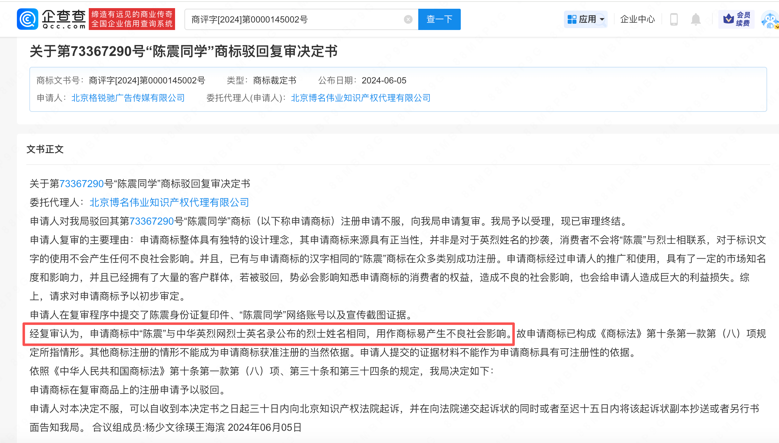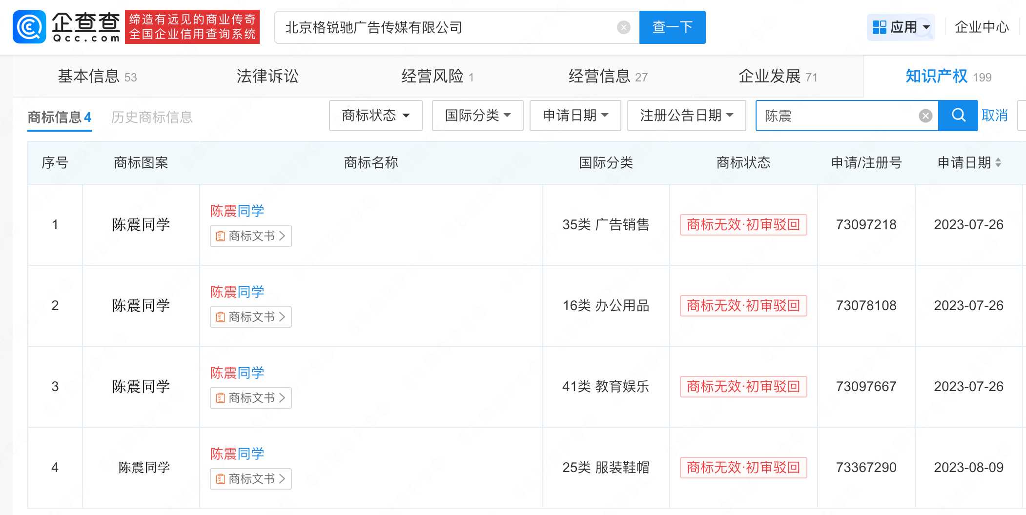 【陈震被全平台禁言,陈震同学商标均被驳回】陈震多平台账号被禁言陈震回应被多平台禁言 近日,车圈网红陈震多平台账号全部被禁言引发热议,其本人通过另一个账号发文回应称“没啥可说的,检讨自己…………”据企查查信息显示,陈震关联的MCN萝卜报告关联公司北京格锐驰广告传媒有限公司成立于2014年10月,注册资本500万,陈震持有54%股权并担任董事,当前该公司现存1则欠税公告,欠税余额2965.14元,欠税税种为印花税。值得一提的是,该公司曾申请多枚“陈震同学”商标,均被初审驳回被判无效。文书显示,经复审认为,申请商标中“陈震”与中华英烈网烈士英名录公布的烈士姓名相同,用作商标易产生不良社会影响。