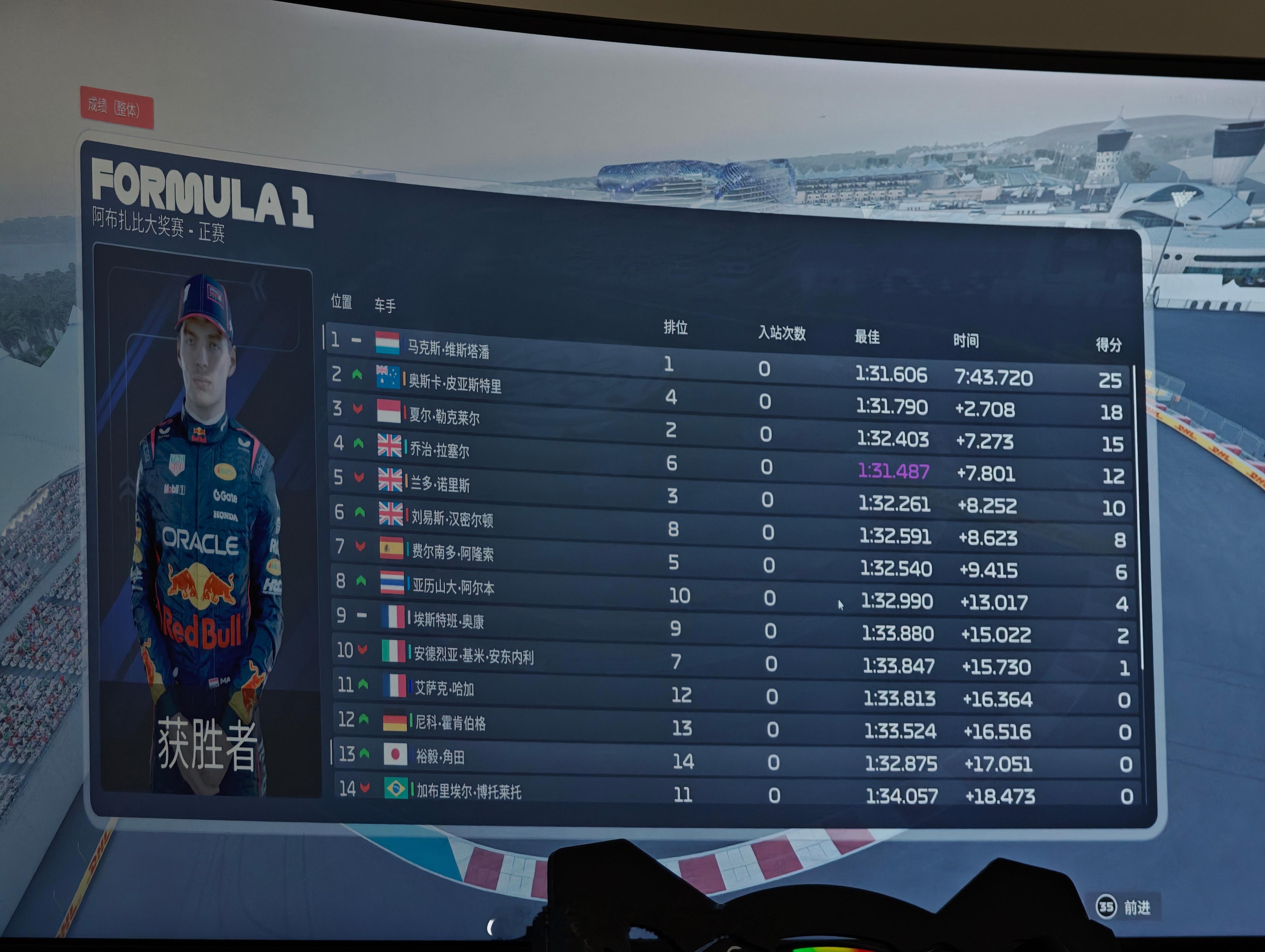 抓猫开车昨晚我和舍友用维斯塔潘跑了一晚的阿布扎比~愣是被舍友从排位赛跑到杆位,然