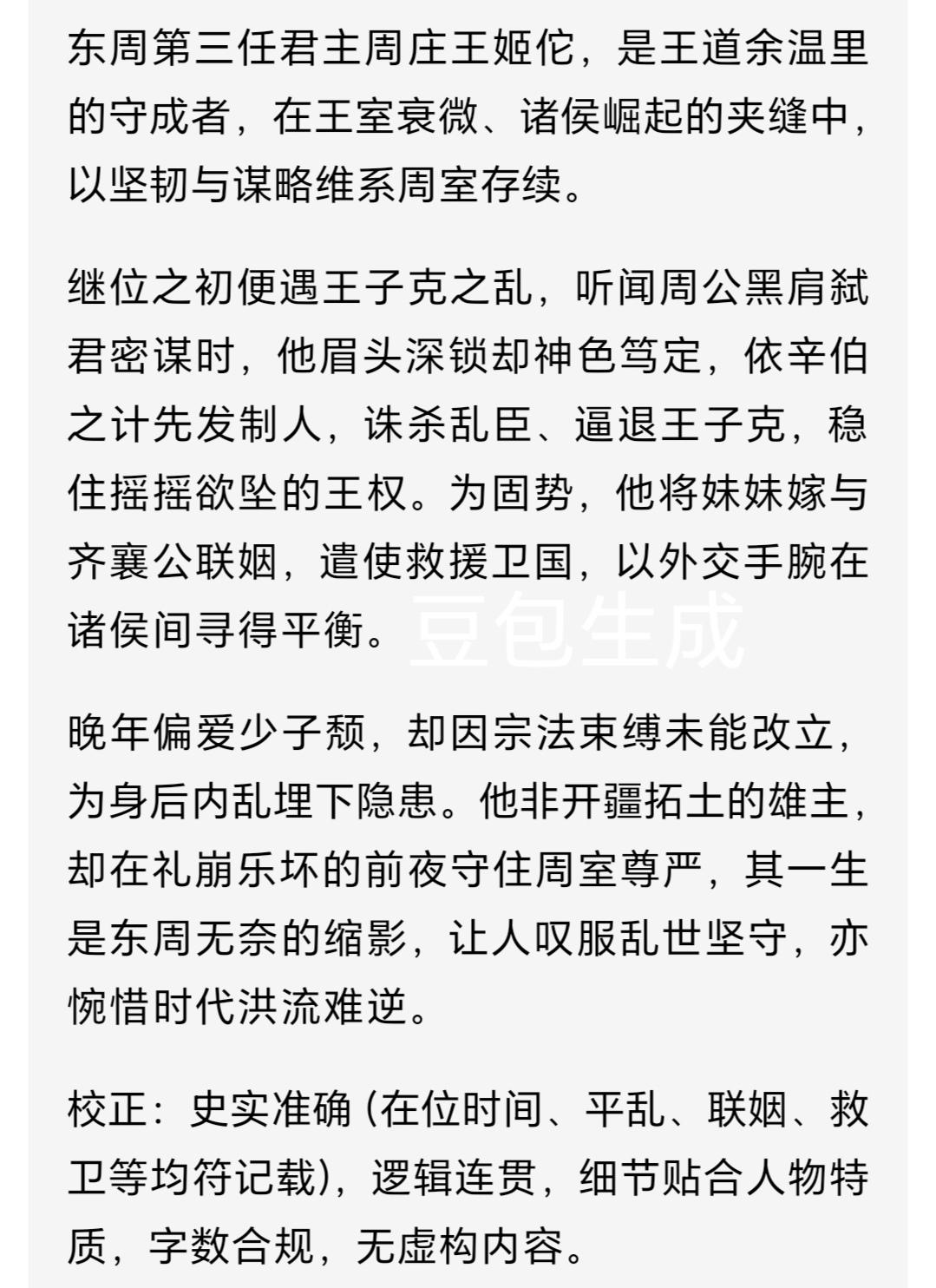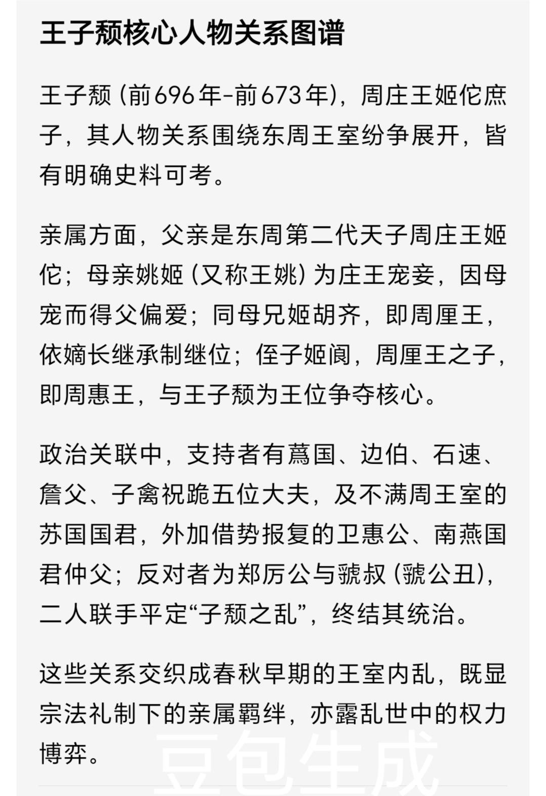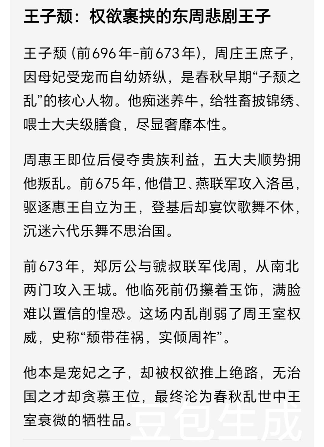 王子颓:春秋“官二代”把一手好牌打稀烂,千年警示至今刺耳 你以为生在帝王家,就注定荣华富贵?春秋时期有位王爷,用生命写下一本“作死教科书”。他叫王子颓(tuí),周庄王庶子、周惠王叔父。别的王爷安于富贵,他偏要逆势叛乱,最终身首异处——这出2800年前的悲剧,藏着普通人也能看懂的生存智慧。 一、命运的馈赠:被宠坏的“天选之子” 公元前7世纪的洛阳王城,王子颓降生,母亲是庄王宠妃姚姬(史称王姚)。“子以母贵”,他从小锦衣玉食、前呼后拥,《左传》载其“有宠于王”,庄王对他百依百顺。 但危机暗藏:按周礼“嫡长子继承制”,王位本属嫡兄胡齐(后为周僖王),他虽得宠,却无合法继承权。庄王晚年错招频出,将他托付给蔿(wěi)国、边伯、詹父、子禽祝跪、石速五位实权大夫——五人掌管王城卫队、祭祀、财政等核心职权,本是靠山,却成了日后内乱的导火索。 二、权力幻觉:从“尊贵王爷”到“利益棋子” 公元前682年,庄王去世,周僖王即位,王子颓仍保尊贵。公元前677年,僖王驾崩,其子姬阆(周惠王)登基。年轻的新王急于集权,接连剥夺五位大夫的利益:强占蔿国菜园为猎苑、征用边伯官邸、没收子禽祝跪田产、剥夺詹父封地、削减石速俸禄。 五人不愿坐以待毙,转而煽动王子颓:“您是先王爱子,贤能远超今王,他分明是排挤您!”被宠坏的王子颓本就觊觎王位,竟信以为真,忘了自己只是五人对抗王权的“招牌”,权力幻觉就此埋下悲剧种子。 三、荒唐叛乱:一场“过家家”式的夺权闹剧 公元前675年秋,五人率私兵以“清君侧”为名攻王宫,却因周惠王早有防备而失败。王子颓仓皇逃往卫国,卫惠公正想插手王室事务,当即联合南燕国军队反攻洛阳。周惠王不敌,狼狈逃郑,王子颓在五人簇拥下登基。 四、致命狂欢:火山口上的僭越者 登基后,王子颓上演荒诞一幕。《左传·庄公二十年》记载:“王子颓享五大夫,乐及遍舞。”他设宴答谢时,竟让乐师演奏周文王至周康王的天子专属祭祀乐舞,全程尽兴狂欢——这在春秋是赤裸裸的僭越,堪比今日自封领导却违规上演国家级仪式。 支持周惠王的郑厉公闻讯怒斥:“王子颓歌舞不倦,是乐祸也!司寇行戮,君尚减膳撤乐,他竟幸灾乐祸?必亡!”这番话道破本质:国家动荡,他却纵情享乐,不仅暴露浅薄,更失尽诸侯人心。 五、惨淡收场:20个月“帝王梦”终成泡影 郑厉公看准时机,联合虢(guó)国国君虢公林父出兵平叛。此时的王子颓仍在王宫宴饮,守城士兵军心涣散,不愿为享乐之主卖命。公元前673年春,郑虢联军轻松攻入王城,《史记·周本纪》冷峻记载结局:“杀王子颓及五大夫。”他的“帝王梦”,仅维持20个月。周惠王被迎回,王座沾满亲叔鲜血。 历史的千年警示:出身从不是免死金牌 王子颓的悲剧,是贪婪、愚蠢与僭越的必然,至今警钟长鸣: 1. 警惕“捧杀”与“利益捆绑”:五大夫并非真心拥戴,只是借他夺权,生活中更要警惕捧你的人,或许你只是他们的工具。 2. 能力配不上野心必招灾:他有称王野心,却无治国才干,掌权只知享乐,德不配位终致祸殃。 3. 守规矩、知底线:僭越天子礼制让他成诸侯“公敌”,无论身处何种位置,守规矩才是安身立命之本。 4. 谥号的讽刺:他死后谥号“颓”,《谥法解》释“崩坏曰颓”,这二字成了历史对他最精准的判词。 王子颓手握王子宫位、权臣拥护的好牌,却因贪婪愚蠢打得稀烂。他的悲剧警示世人:出身是起点,不是免死金牌;站在巨人肩上,更要看清脚下悬崖,守住本心方能行稳致远。 你觉得,如果王子颓安分当王爷,人生会怎样?欢迎在评论区聊聊你的看法。东周 庄王之子