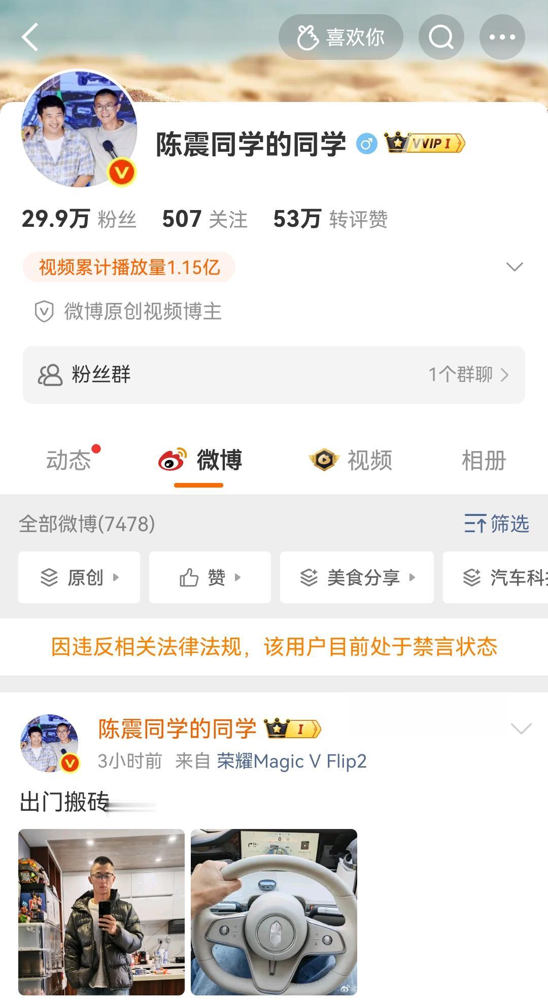 陈震表示要好好反思一下!今天早上用小号发的内容也被禁言了! 小号实际上是不在禁言行列的,因为这个账号的注册是以公司的名义注册的,属于MCN账号,隶属陈震的媒体公司萝卜报告。 然而陈震用这个东西发布他个人的内容之后,上午9点之后该账号也被禁言了。此前该账号是由同事进行运营的,发的内容基本上和陈震有关,或者发一些图片之类。 各位是怎么看的?欢迎评论区留言。